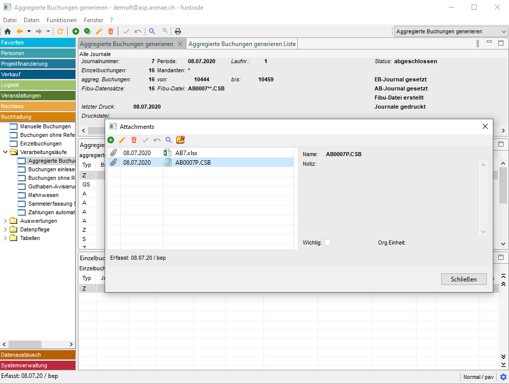 Bei der Aggregierung sind die Dateien für externe Buchhaltung generiert. Diese Dateien sind als Attachments in der Maske für Aggregierte Buchungen ergänzt.