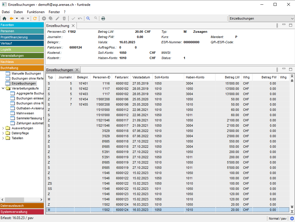Um die Informationen, welche in die externe Hauptbuchhaltung einfliessen, ebenfalls korrekt abbilden zu können, existiert eine entsprechende Struktur namens «EB – Einzelbuchungen». Diese Struktur bildet die buchhalterisch relevanten Daten ab und enthält nur die wichtigen buchhalterischen Informationen wie Faktura Nummer, Person, Betrag, Währung, MWSt, Konti etc. Die Einzelbuchungen enthalten nur die Buchungen, bei denen die tatsächlichen Beträge auf den einzelnen Konten verbucht wurden.