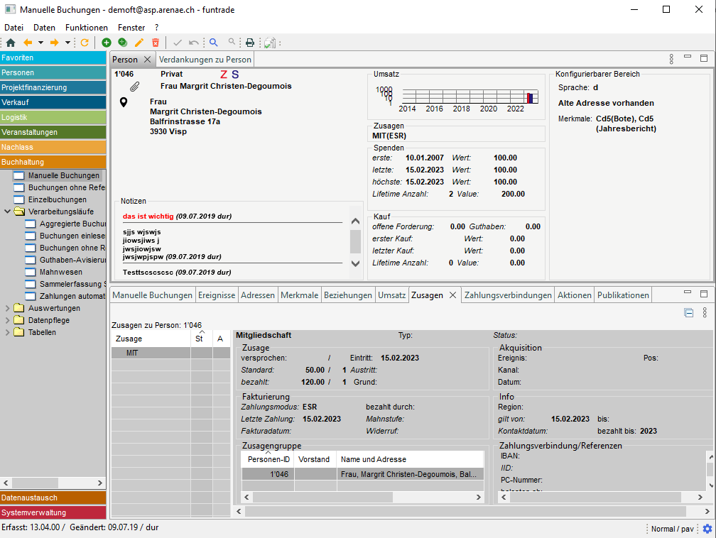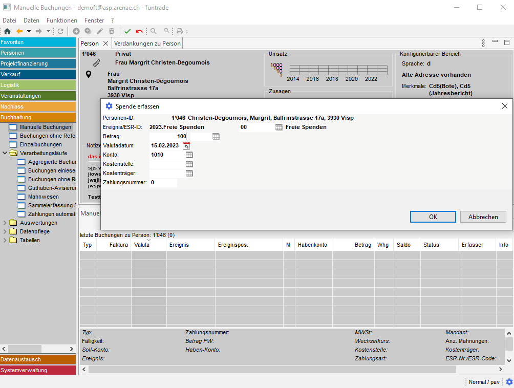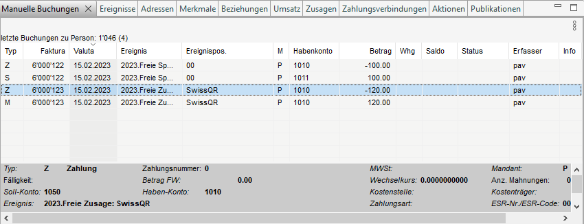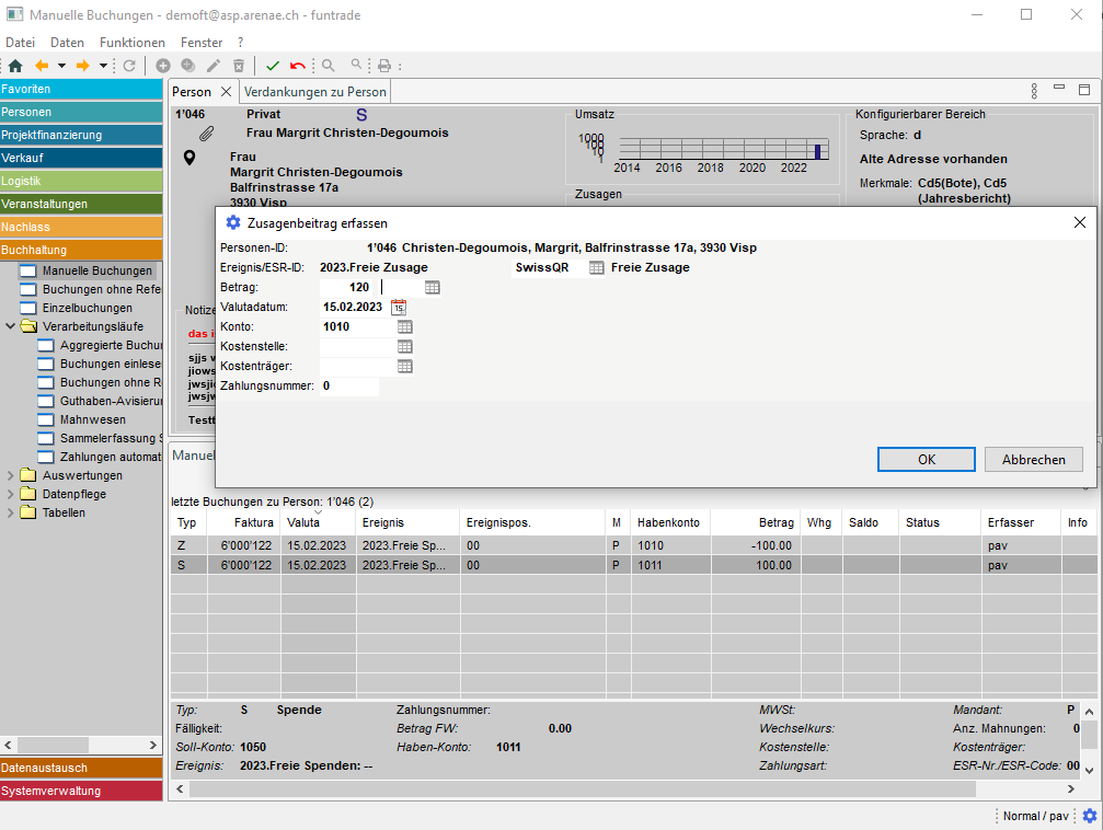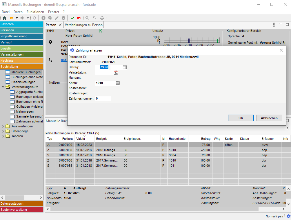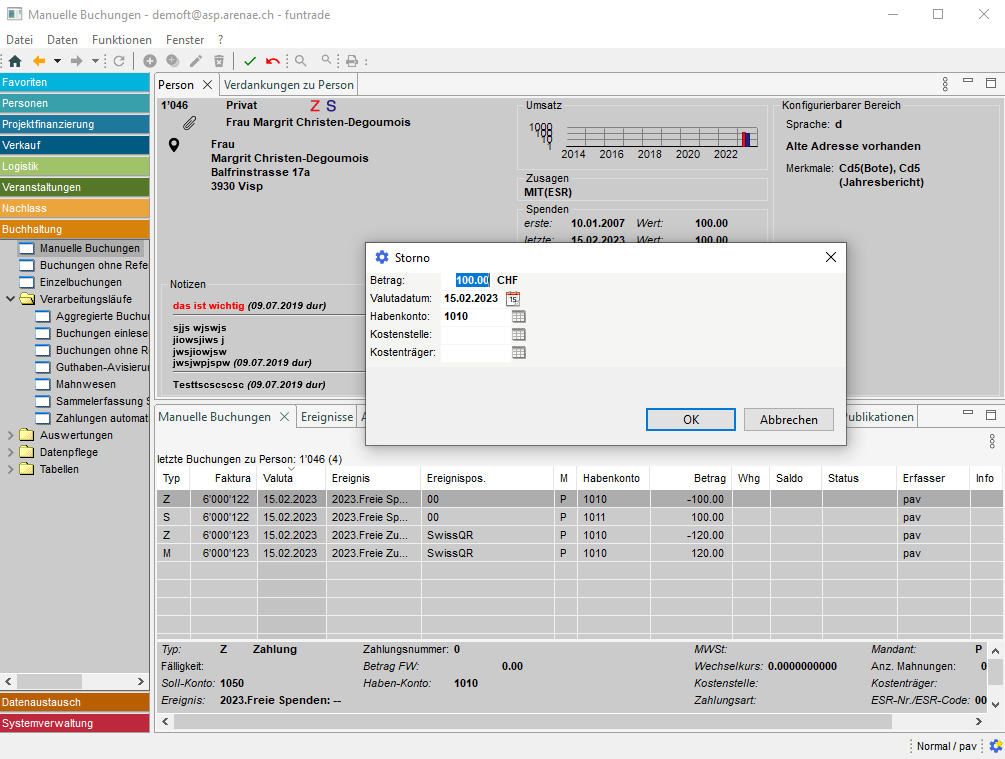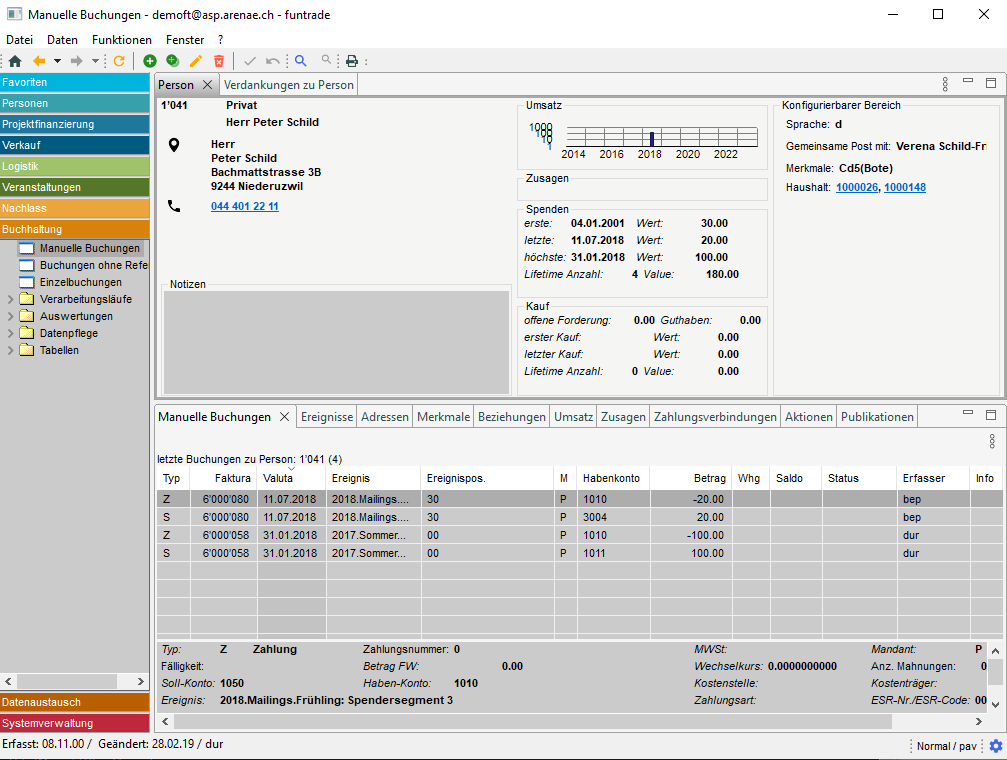 Ein klassisches Nebenbuch der Finanzbuchhaltung, die Debitorenbuchhaltung, verwaltet direkt die aus der Auftrags- bzw. Spendenabwicklung stammenden Daten. Pro Adresse ist jederzeit ersichtlich, welche offenen Forderungen bestehen, wie der aktuelle Mahnstatus pro Forderung aussieht oder ob allenfalls ein Guthaben bei der Adresse vorhanden ist.