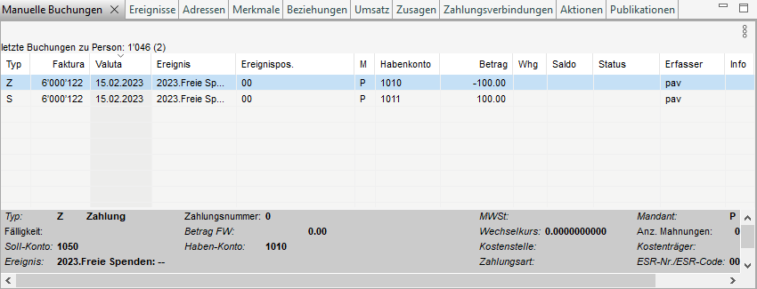 Beim Erfassen einer Spende werden gleichzeitig zwei Buchungen erfasst. Eine Buchung als Zahlung auf das Debitorenkonto und die Spende aus dem Debitorenkonto, so dass der Saldo des Debitorenkontos unverändert bleibt. Beim Erfassen der Spendenbuchung wird ein Spende-Ereignis eingegeben. Das Ertragskonto wird vom entsprechenden Ereigniskopf übernommen. Bei der Zahlungsbuchung müssen der Betrag, das Datum und das Konto eingegeben werden.