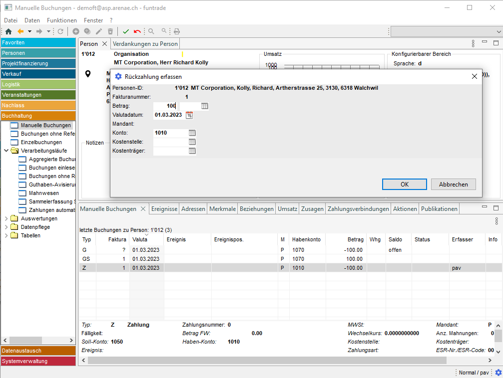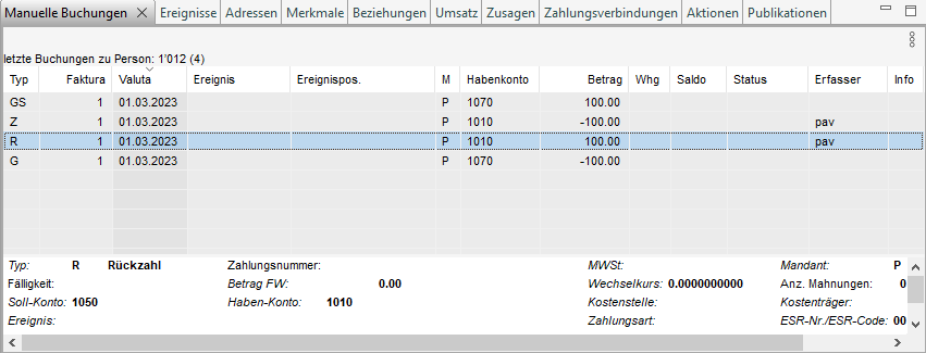 Bei einer Rückzahlung muss der Betrag, das Datum, die Faktura-Nummer und das Konto eingegeben werden. Die Währung der Rückzahlung hängt von der Währung des Habenkontos und der Währung der Faktura ab. Falls keine Faktura mit eingegebener Faktura-Nummer bei der Adresse existiert, so ist einzig die Währung des Habenkontos massgebend.