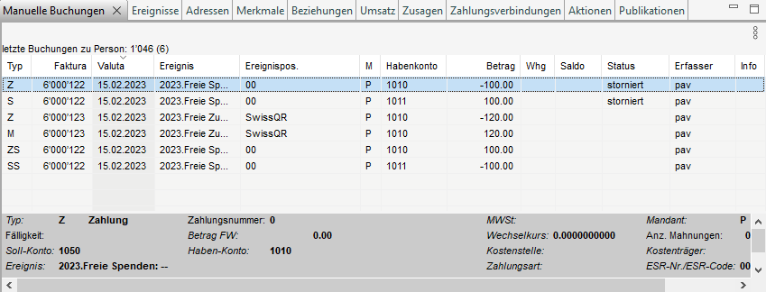 Grundsätzlich können alle manuell erfassten Buchungstypen storniert werden. Eine Stornierung kann nicht mehr rückgängig gemacht werden. Beim Stornieren von Spenden oder Zusagenbeiträgen werden gleichzeitig auch die dazugehörigen Zahlungen storniert. Bei Buchungen in Fremdwährungen wird der ursprüngliche Kurs der Buchung übernommen, unabhängig vom Stornodatum.