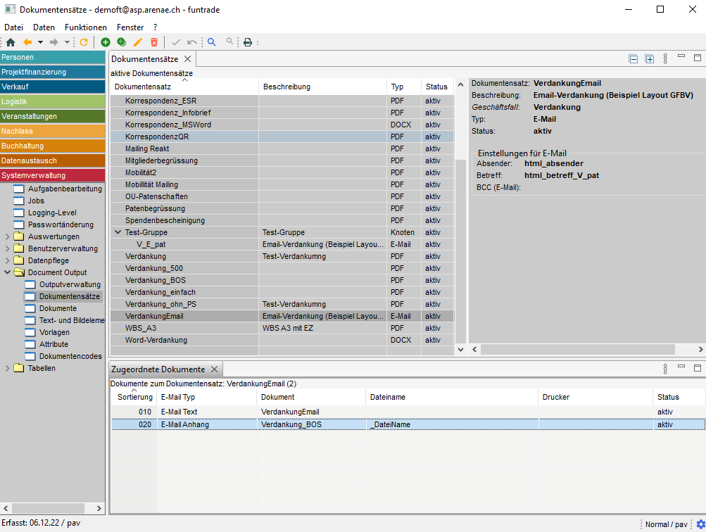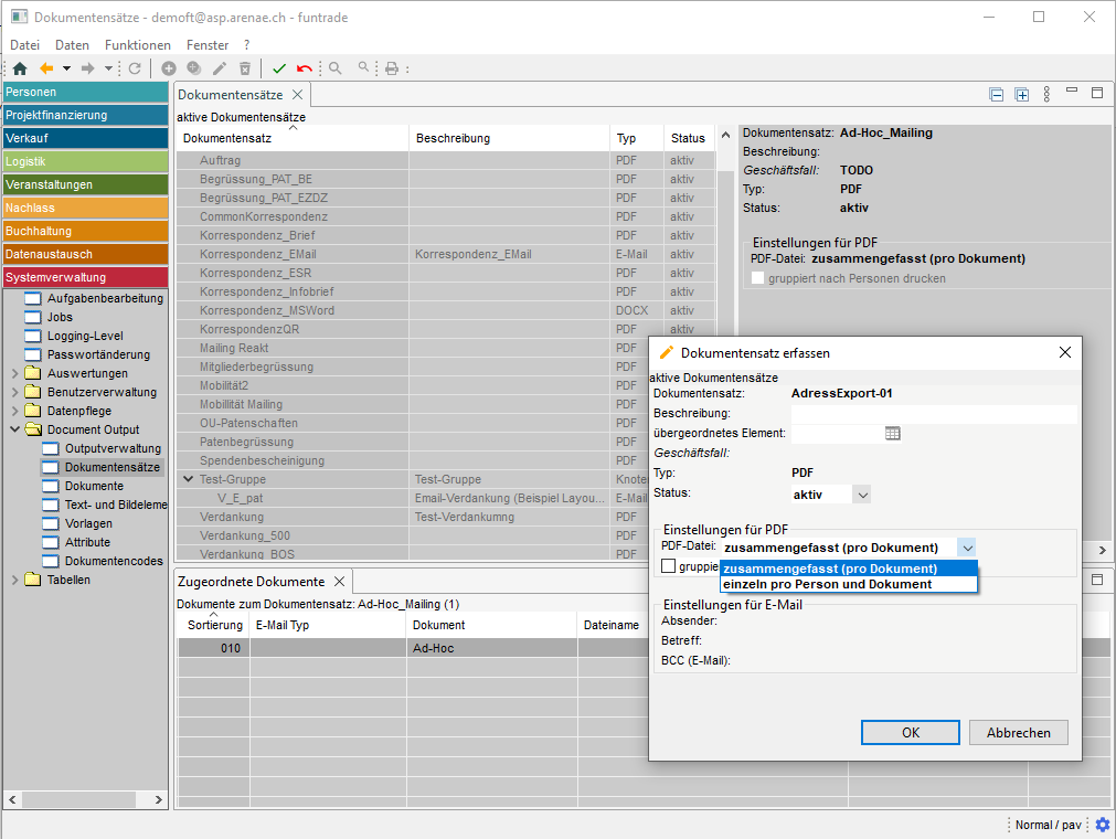 Dokumentensätze können im Menü "System/Document Output/Dokumentensätze" erstellt werden.