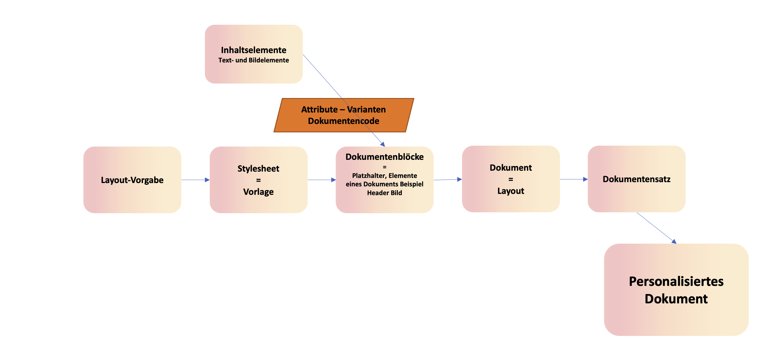 Für die einzelnen Inhaltselemente kann man auch Attribute definieren. Attribute ermöglichen es, Inhaltselemente der Dokumentenblöcke anhand definierter Bedingungen zu steuern, z. B. anhand der Ansprache der Person, für die personalisierten Dokumente generiert wird. Die Dokumentenblöcke und Attribute werden somit durch die Vorlage (Stylesheet), basierend auf den Anforderungen des Kunden, bestimmt und können im nächsten Prozessschritt bei der Einrichtung des Master-Dokuments nur verwendet, aber nicht mehr verändert werden.