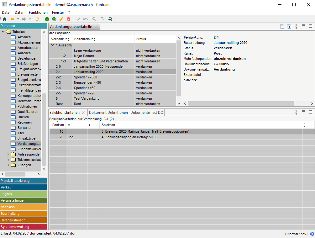 Es gibt mehrere Stellen (z. B. Personen/Tabellen/Verdankungssteuertabelle), an denen festgelegt ist, welcher Dokumentensatz beim Starten eines bestimmten Prozesses verwendet werden soll, z. B. Personen/Verarbeitungsläufe/Verdankungen – Aufbereiten.