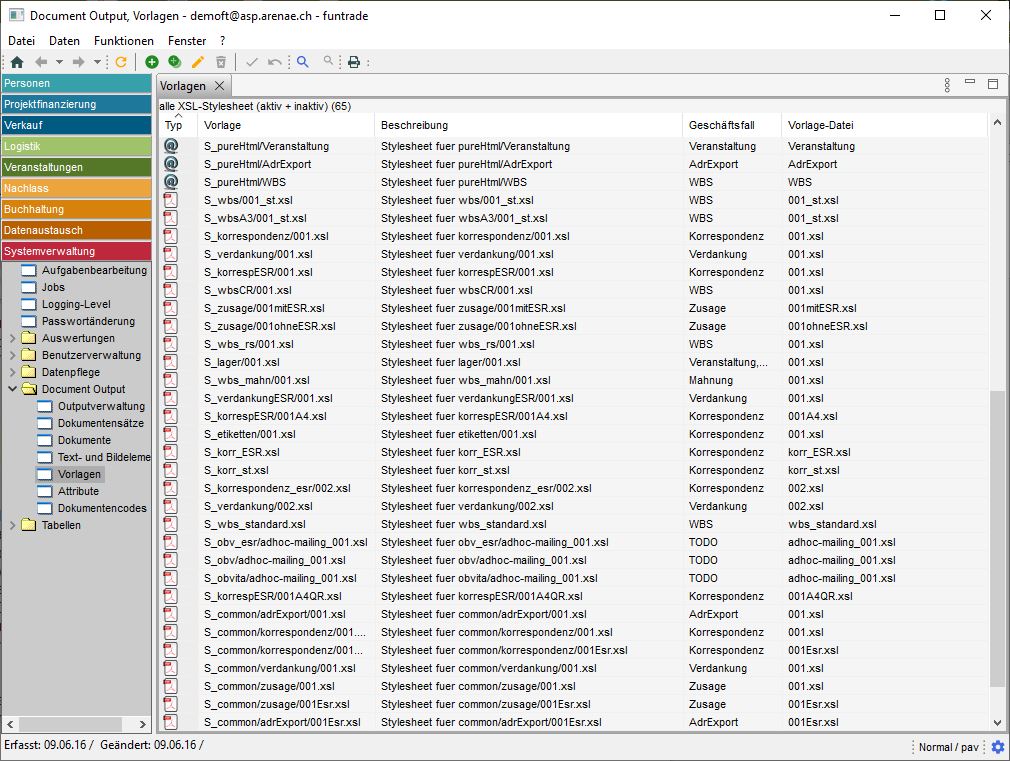 Die Tabelle der Vorlagen kann man in funtrade im Menü „Systemverwaltung/Document Output/Vorlagen" finden. Die Namen der Standartvorlagen beginnen mit „S_common/", zB. S_common/zusage/001.xsl.
