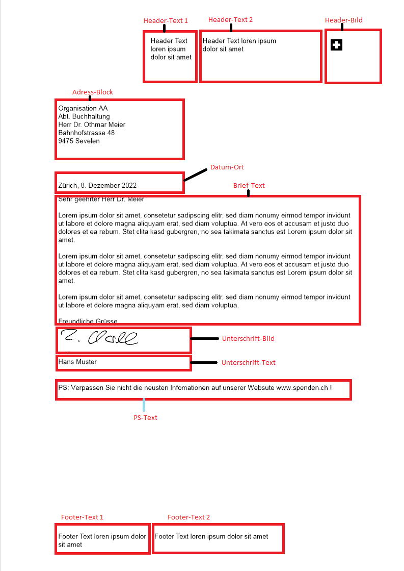 Diese Vorlage ist ein Stylesheet – eine Datei mit einer vordefinierten Struktur (Layout) von Dokumentenblöcken. Über Dokumentenblöcke werden Bildelemente ausgewählt, die für Texte, Bilder oder auch kompliziertere Strukturen, z. B. Tabellen, verwendet werden. In der Vorlage werden einzelne Elemente (Teile) des Master-Dokuments, deren Lage und Größe (Abmessungen) im definiert. Die Vorlage bestimmt auch die Abmessungen des Master-Dokuments, z.B. A4, A4 + QR-Rechnung, und die Schriftarten, die im Master-Dokument verwendet werden.