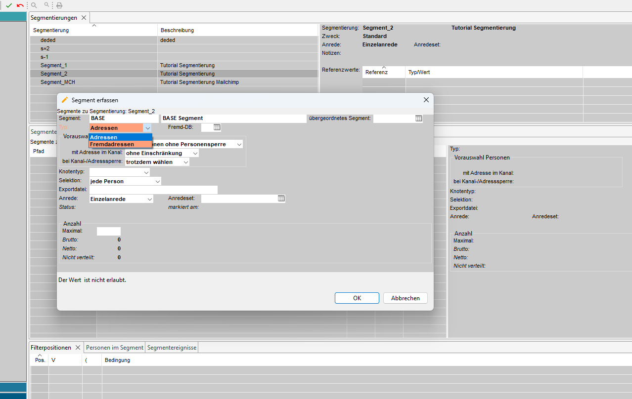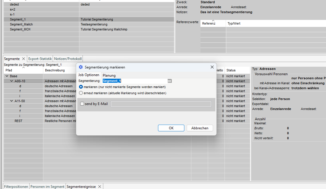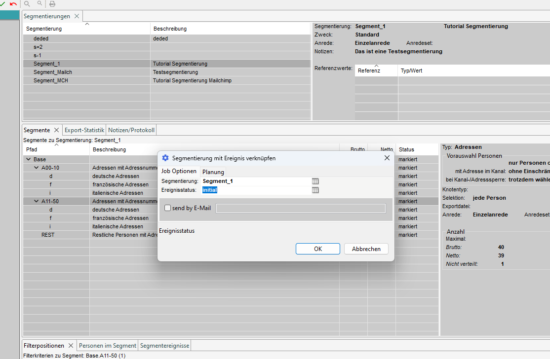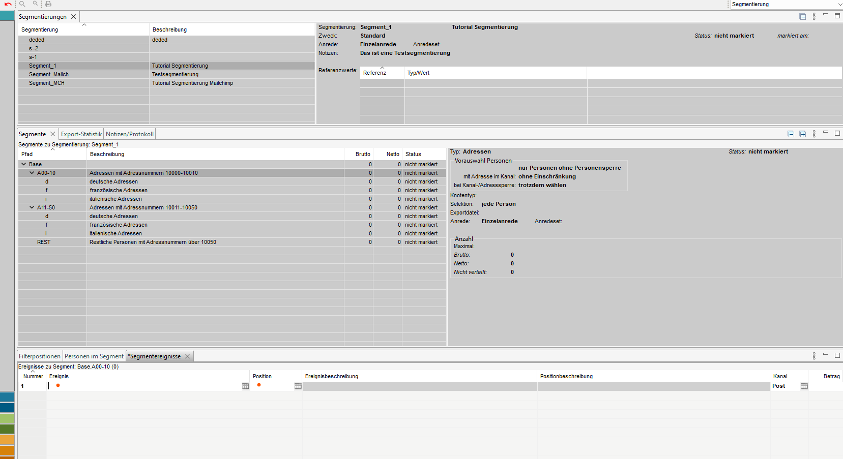 Jedem Segment können wir ein oder mehrere Ereignisse zuordnen, die in der Verarbeitung für die entsprechenden Adressen angelegt werden. Diese Ereignisse können im Tab "Segmentereignisse" erstellt und angezeigt werden.