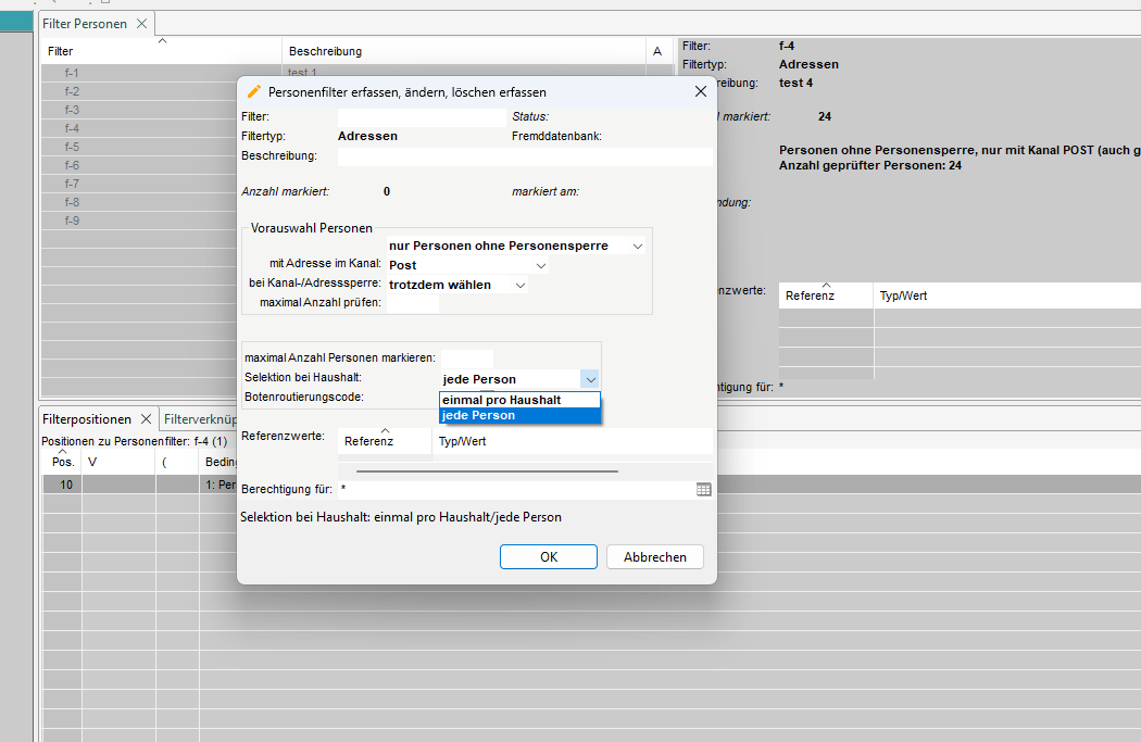 - Selektion - hier können wir wählen, ob wir nur eine Adresse oder alle Adressen innerhalb des Haushalts haben wollen