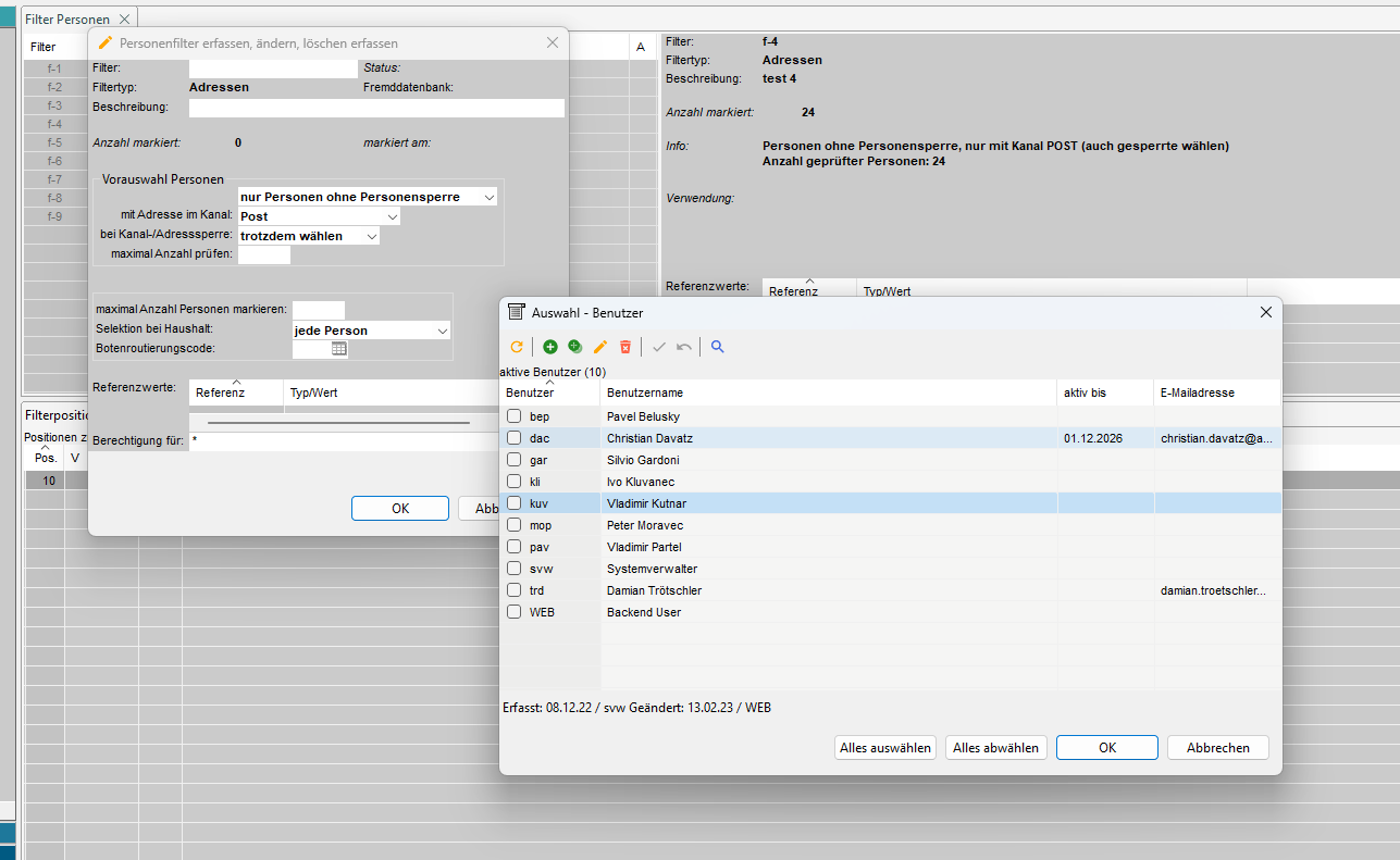 Der Tab 'Personen im Filter' zeigt alle Adressen an, die unter Berücksichtigung der Definitionen und der entsprechenden Filterpositionen ausgewählt wurden.