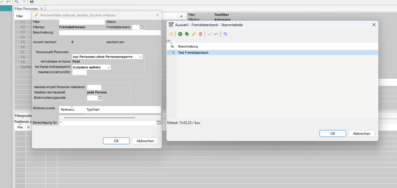Beim Erstellen eines Filters für fremde Adressen gelten die gleichen Bedingungen wie für einen Filter des Typen 'Adressen'. Der einzige Unterschied ist, dass wir noch angeben müssen, aus welcher Fremddatenbank die Adressen ausgewählt werden sollen.