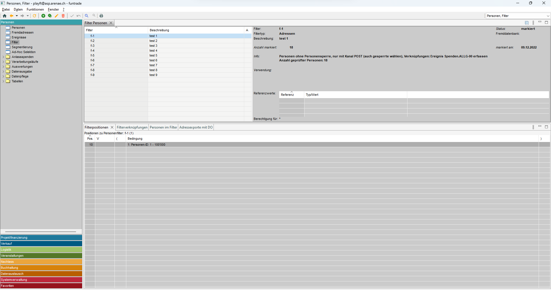 Die grundlegende Aufgabe des Filters ist: eine bestimmte Teilmenge der von funtrade verwalteten Personen auszuwählen. Mit der so ausgewählten Personengruppe können weitere Aktionen durchgeführt werden, zum Beispiel personalisierte Dokumente für sie erstellen.