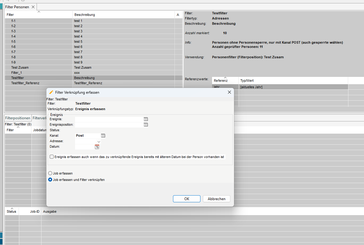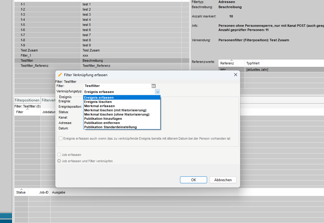 Wie oben erwähnt (Punkt 1.2 Einleitung Filter) können wir mit den 'Filterverknüpfungen' festlegen, welche zusätzlichen Aktionen wir mit den für den Filter ausgewählten Adressen durchführen wollen. Zum Beispiel können wir für alle Adressen ein Merkmal oder ein Ereignis erstellen oder löschen.