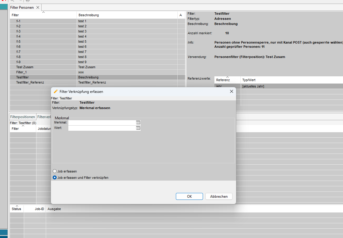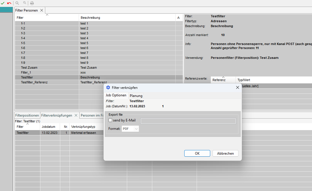 Im Tab 'Filterverknüpfungen' können wir festlegen, welche zusätzlichen Aktionen wir mit den für den Filter ausgewählten Adressen durchführen wollen. Zum Beispiel können wir für alle Adressen ein Merkmal oder ein Ereignis erstellen oder löschen.