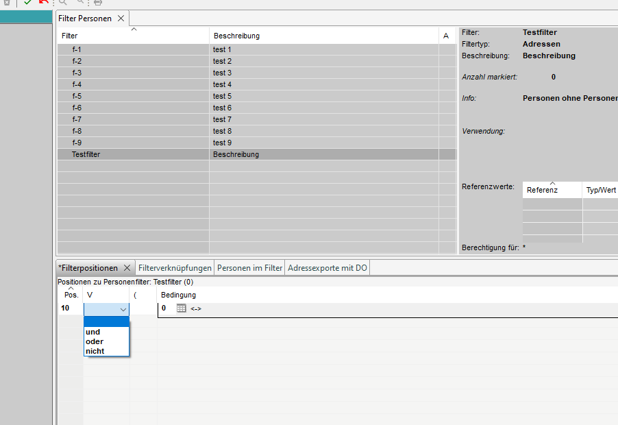 Der einzige Unterschied besteht darin, dass wir mit dem Typ 'Zusammenführung' nur Positionen für das Filterkriterium Nummer 4 anlegen können. Mit diesem Kriterium geben wir dann eine andere Filternummer an, ab der die Adressen zusammengeführt werden sollen. Es ist auch nicht möglich, Bedingungen für 'und', 'oder' oder 'nicht' anzugeben. Die Beziehung 'und' wird immer berücksichtigt.