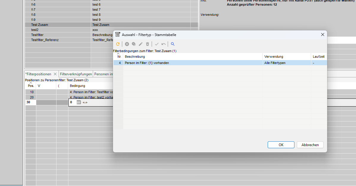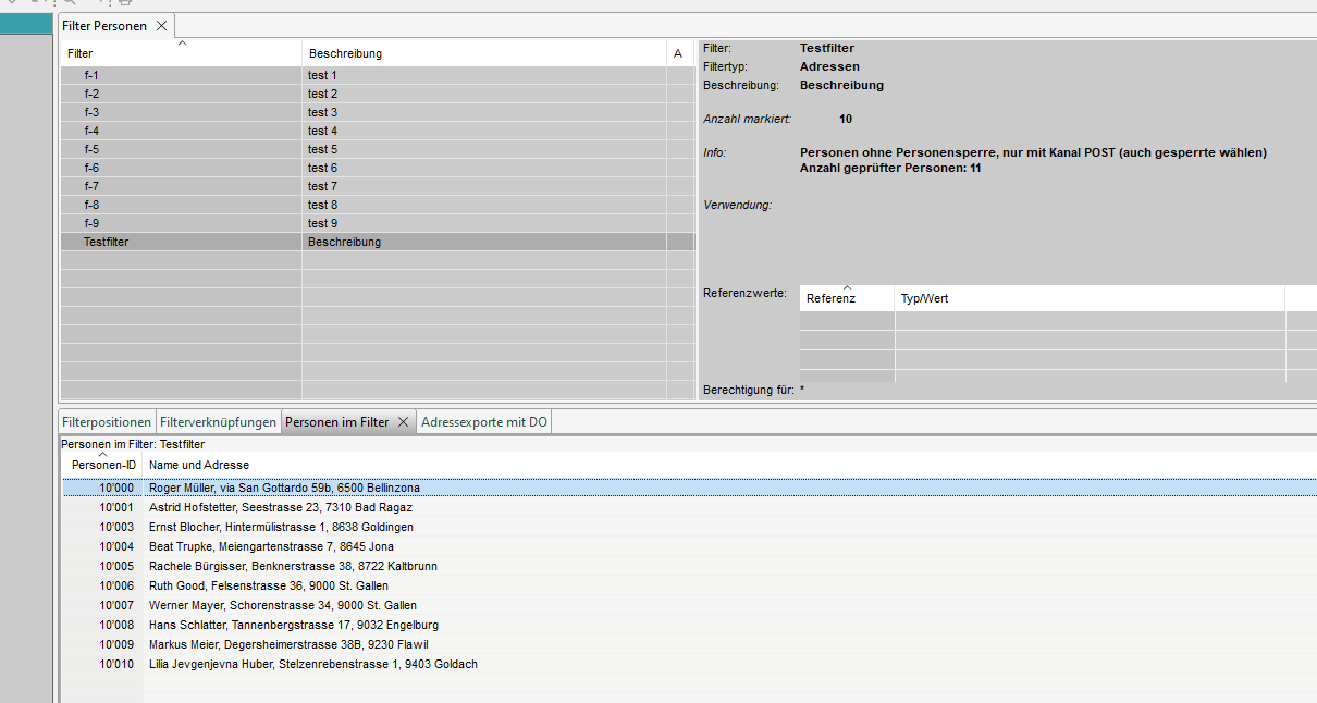 Im Tab 'Filter Personen' ist eine Übersicht der vorhandenen Filter.
