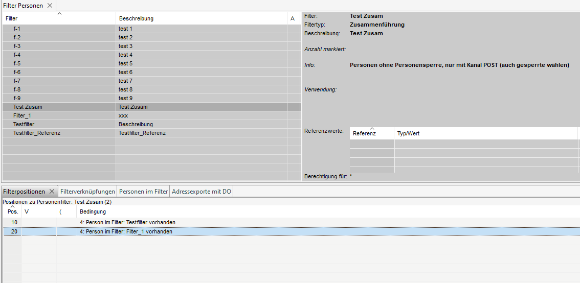 Dieser Filtertyp ist im Wesentlichen dazu gedacht, Adressen aus vorbereiteten Filtern zu verketten. Ein Beispiel: Wir haben Filter A mit 10 Adressen und Filter B mit 2 Adressen. Mit dem Filtertyp 'Zusammenführung' und der entsprechenden Filterposition können wir einen Filter mit Adressen aus beiden Filtern erstellen.