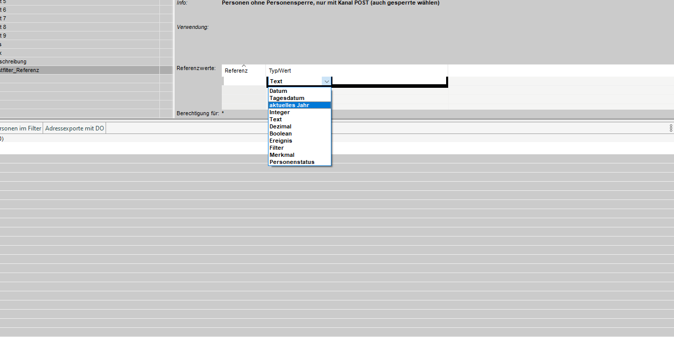 In diesem Feld wird ein bestimmtes Kriterium für die Auswahl der Adressen ausgewählt. Wenn Sie auf das Symbol klicken, wird eine Liste der verfügbaren Kriterien angezeigt. In dieser Liste gibt es auch eine Spalte 'Verwendung', die festlegt, für welchen Filtertyp er bestimmt ist (zum Beispiel ob er nur für Adressen oder für Fremdadressen bestimmt ist).
