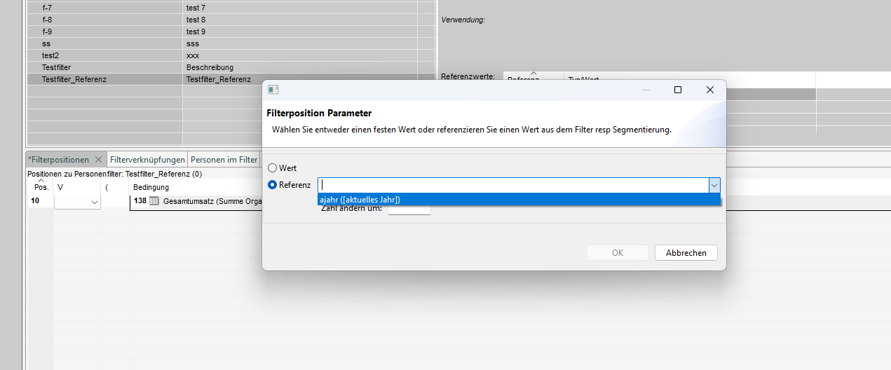 Nachdem die Erstellung abgeschlossen ist, sehen wir im Abschnitt 'Referenzwerte' die gerade erstellte Referenz 'ajahr' für den Typ/Wert '[aktuelles Jahr]'.