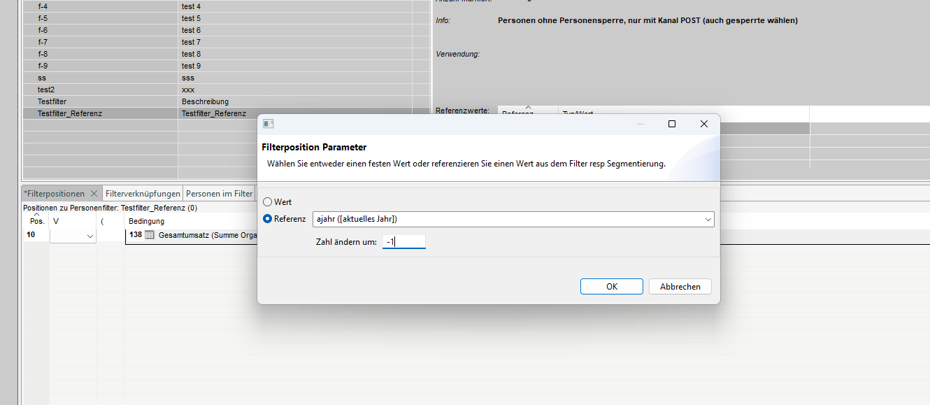 Die Felder, die zu den 'Referenzwerten' gehören, sind bei der Filtererstellung nicht editierbar. Die entsprechenden Werte in den Feldern "Referenz" und "Typ/Wert" können nach der Erstellung des Filters eingegeben werden.