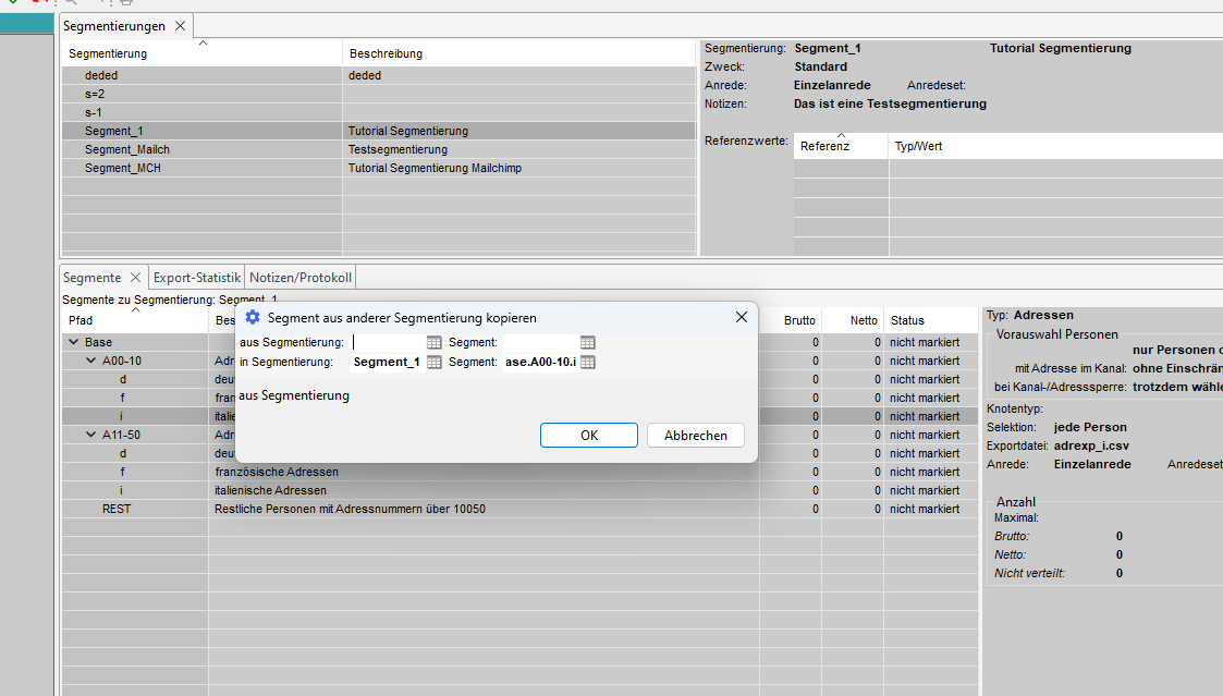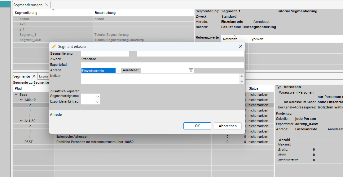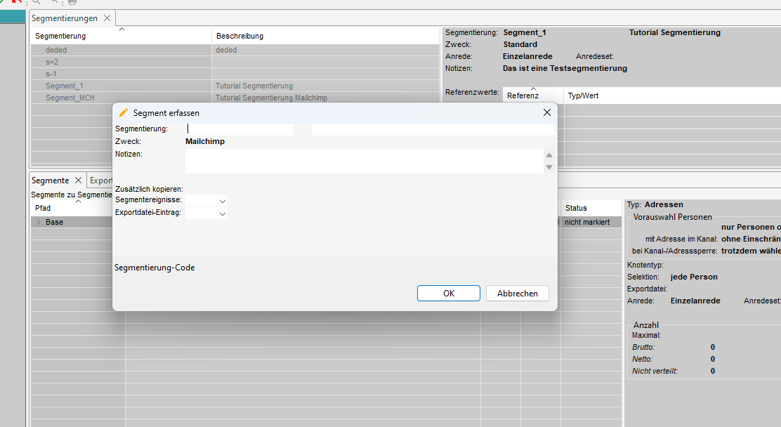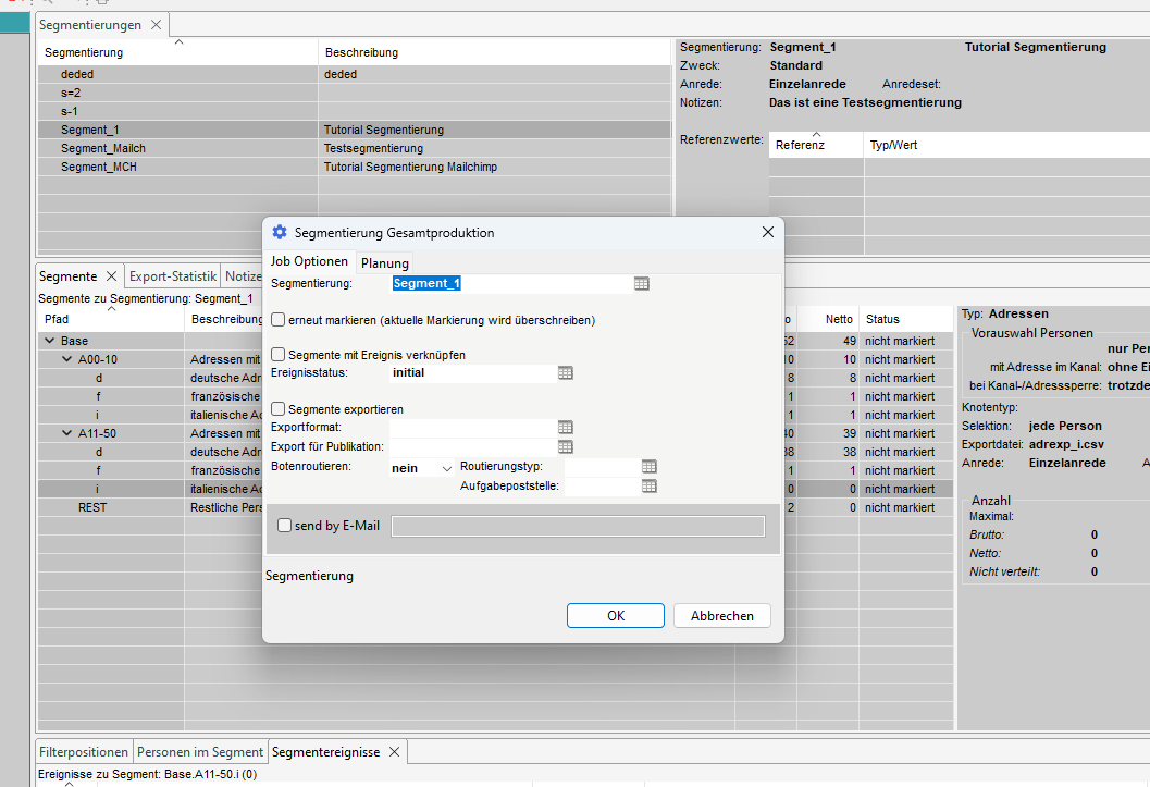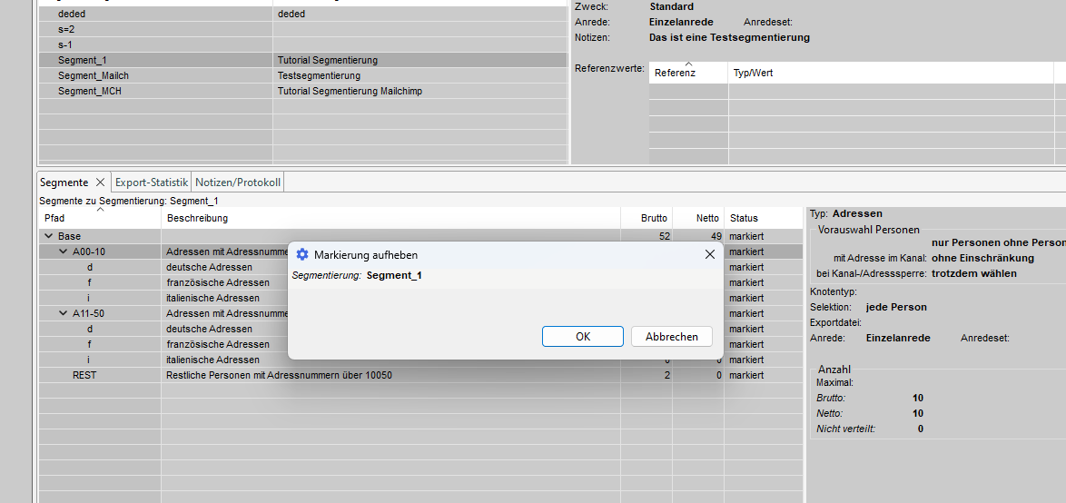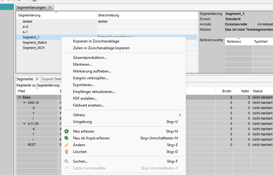 Im Tab 'Segmentierungen' werden die vorhandenen Segmentierungen angezeigt und auf der rechten Seite finden Sie detaillierte Informationen über die Segmentierung.