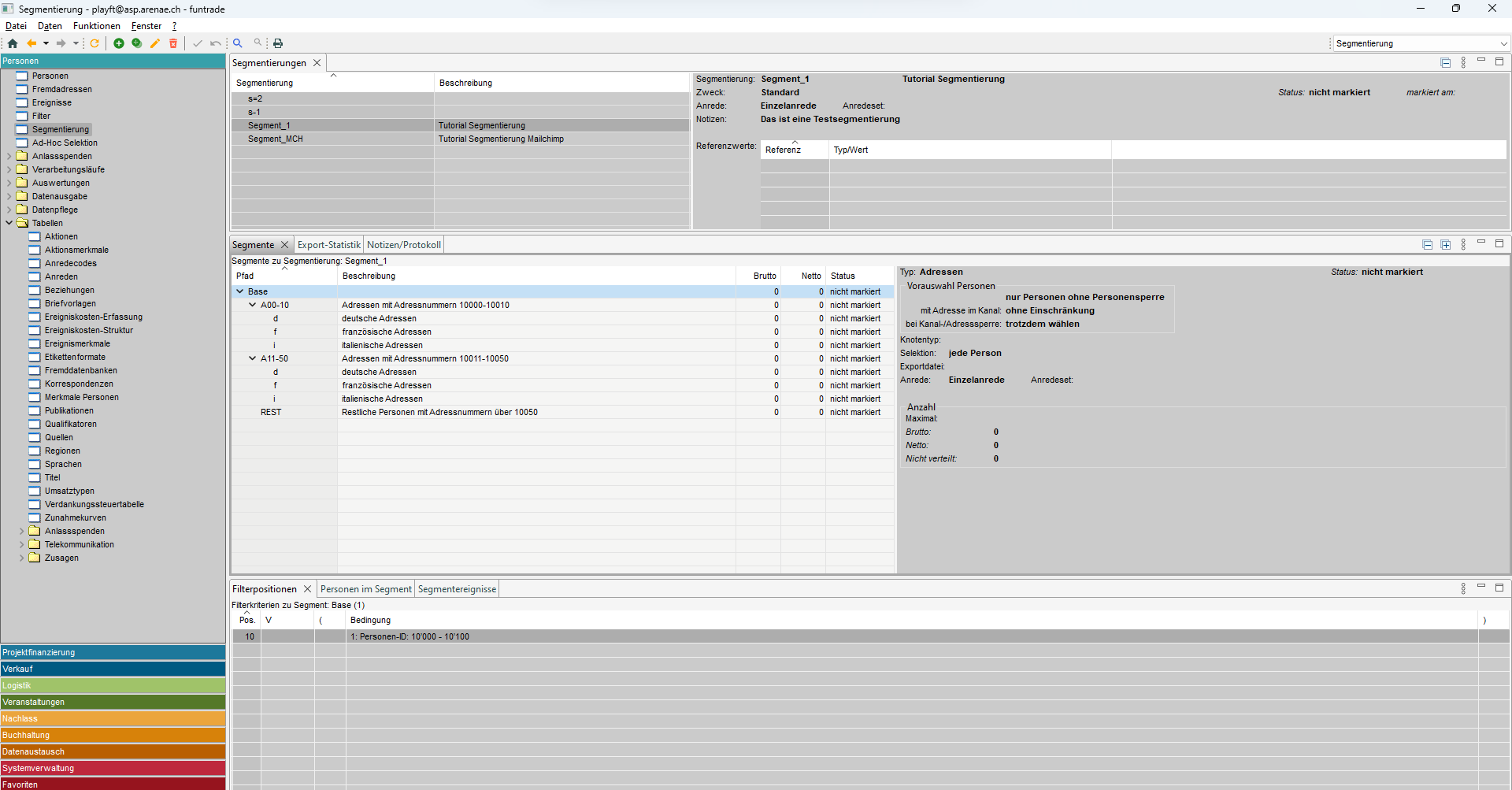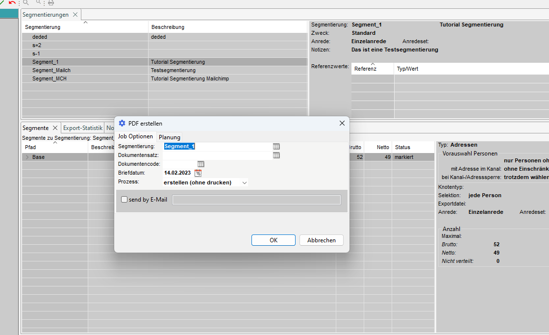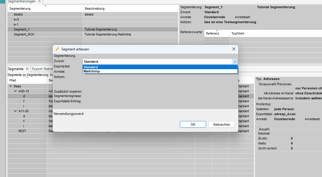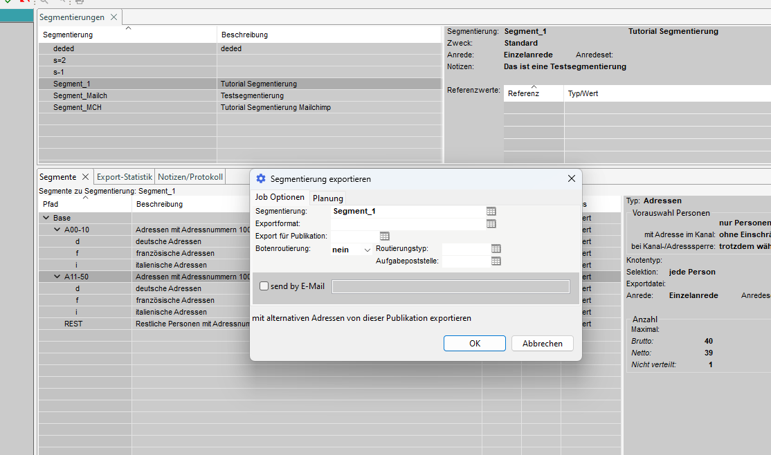 Im Tab 'Segmentierungen' werden die vorhandenen Segmentierungen angezeigt und auf der rechten Seite finden Sie detaillierte Informationen über die Segmentierung.