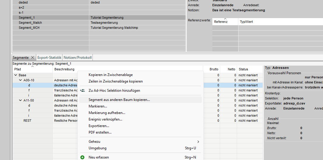 Im Abschnitt "Segment" finden Sie die Segmente für die ausgewählte Segmentierung und auf der rechten Seite finden Sie detaillierte Informationen über das Segment.