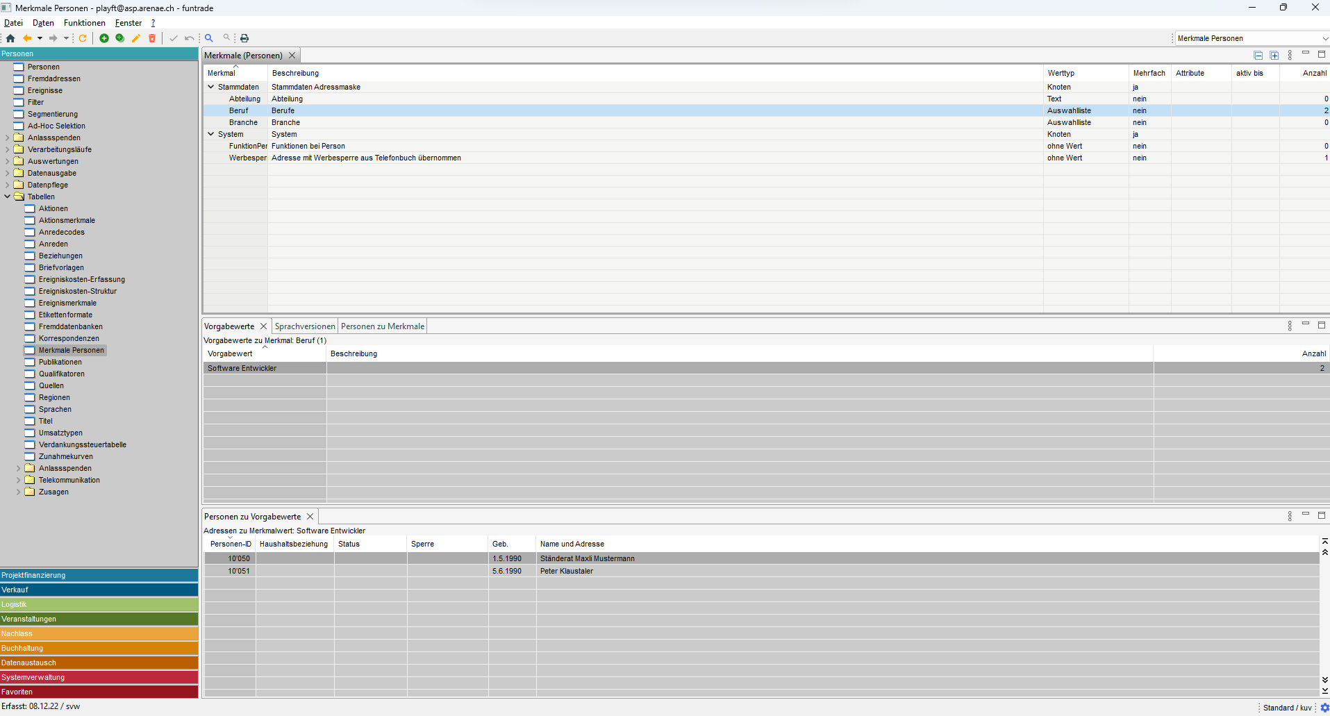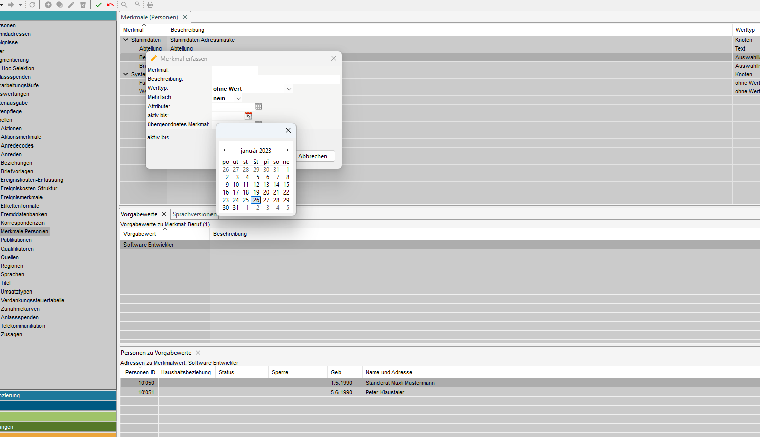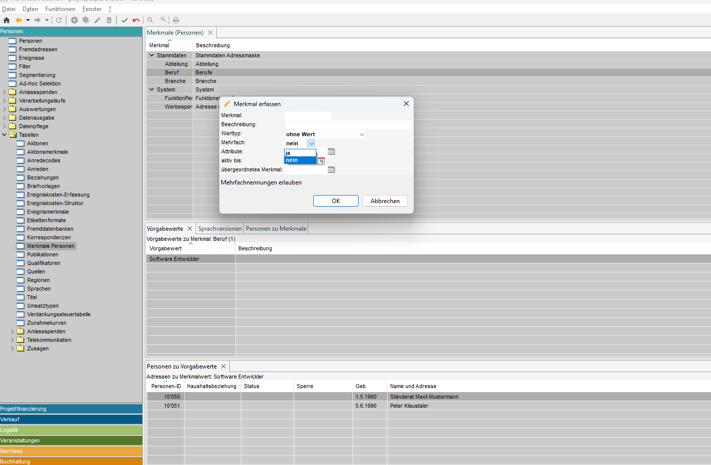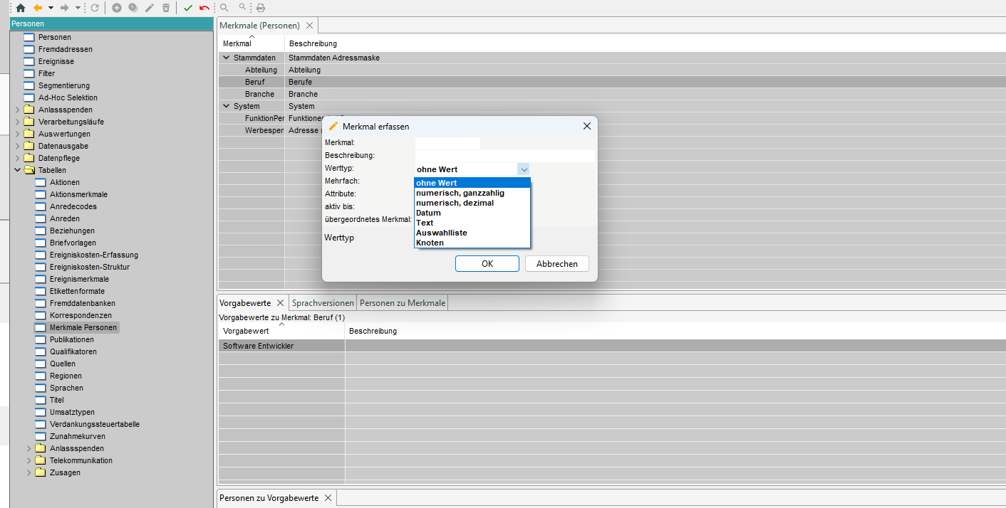 Zudem kann zum Beispiel die Art einer Person ebenfalls mit einem Merkmal definiert werden. Ein Merkmal Personentyp kann z.B. folgende Werte enthalten: