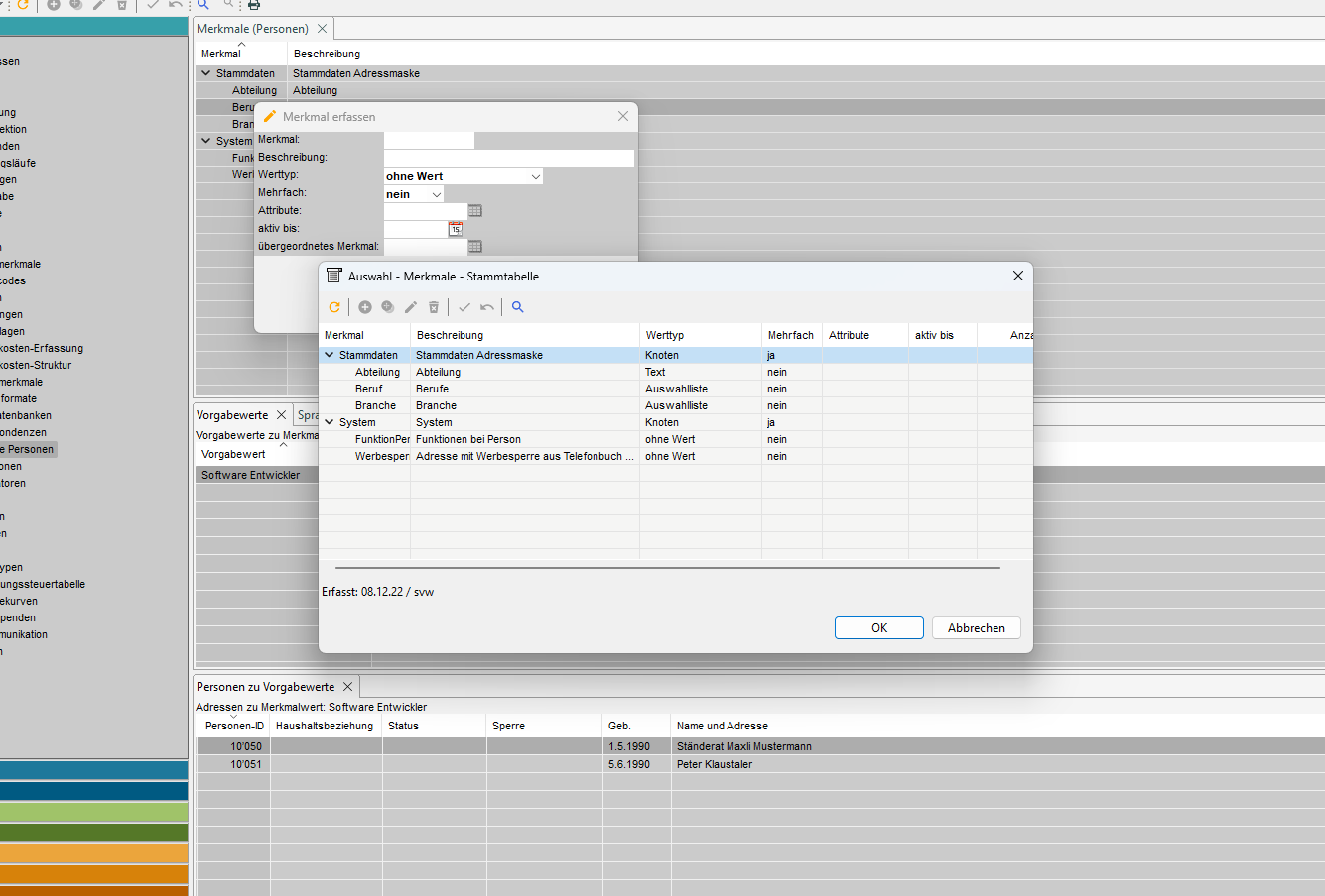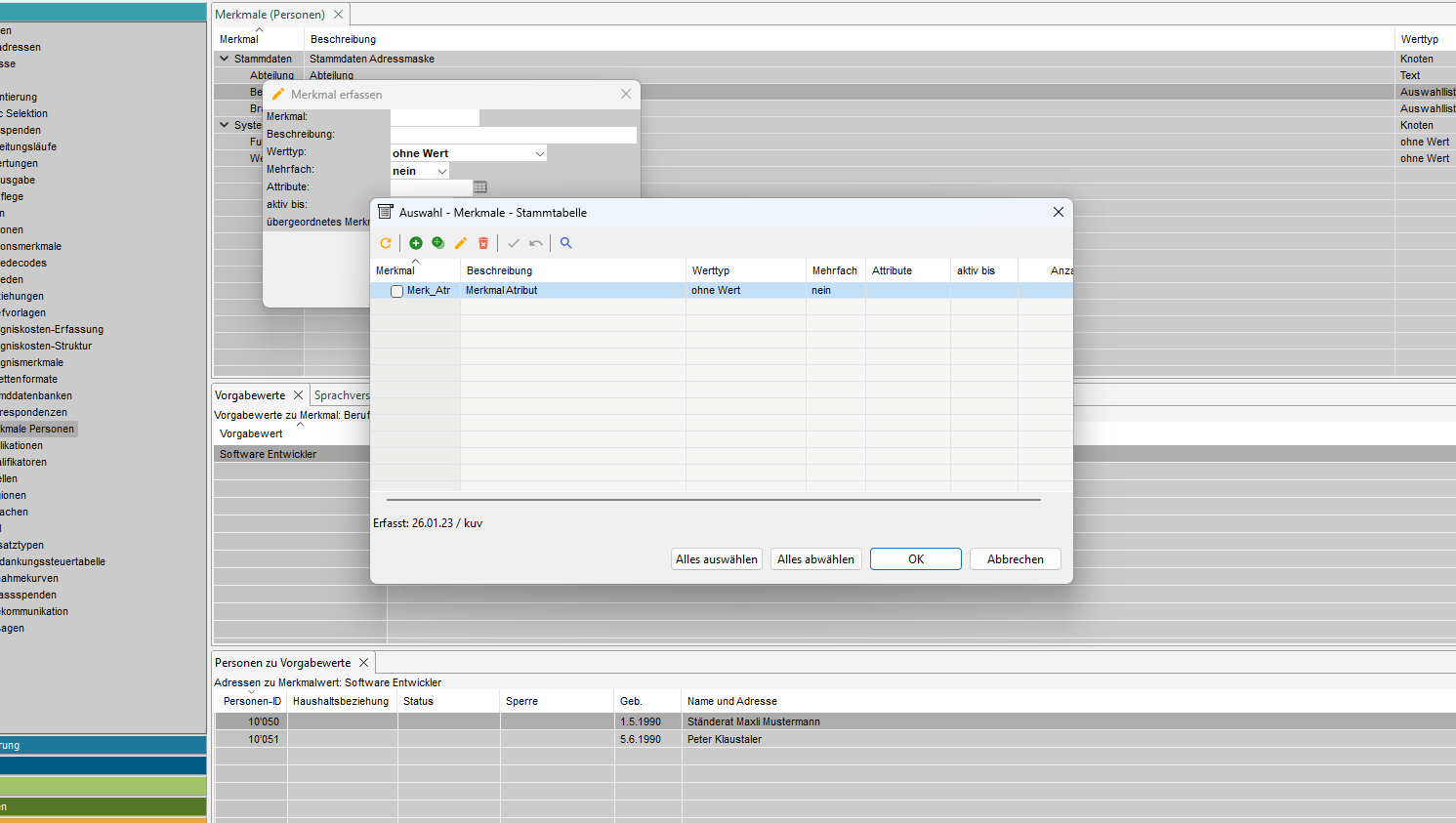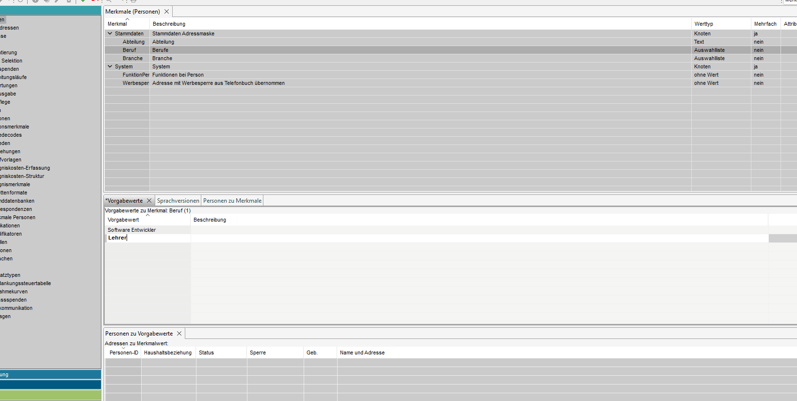 Im Tab 'Personen zu Vorgabewerte' sind nur diejenigen Personen dargestellt, welche zu einem Merkmal mit dem Wertetyp 'Auswahlliste' gehören (z.B. 'ledig').