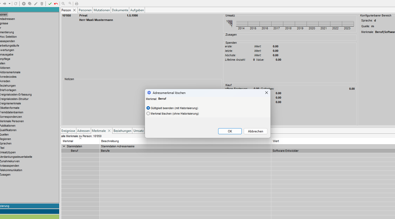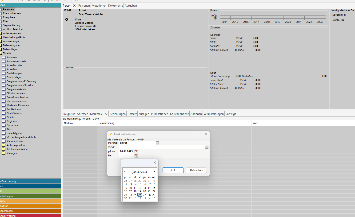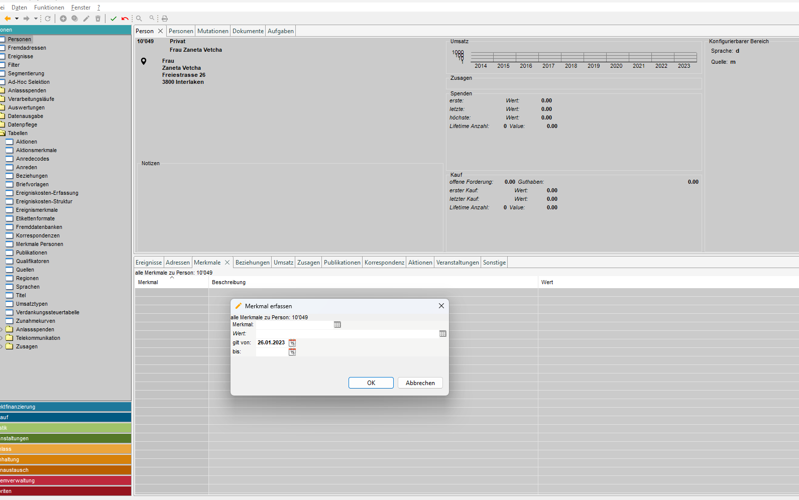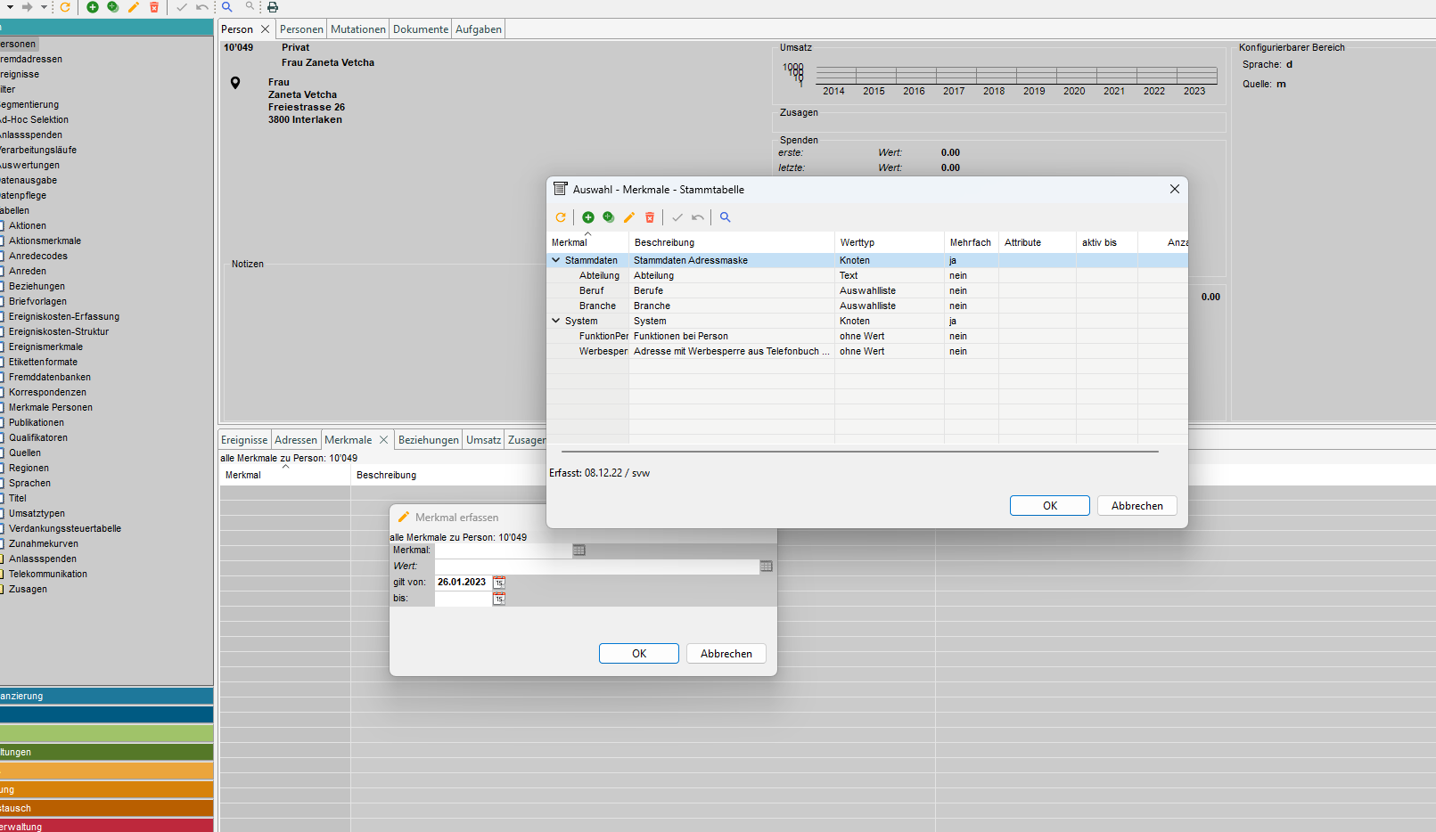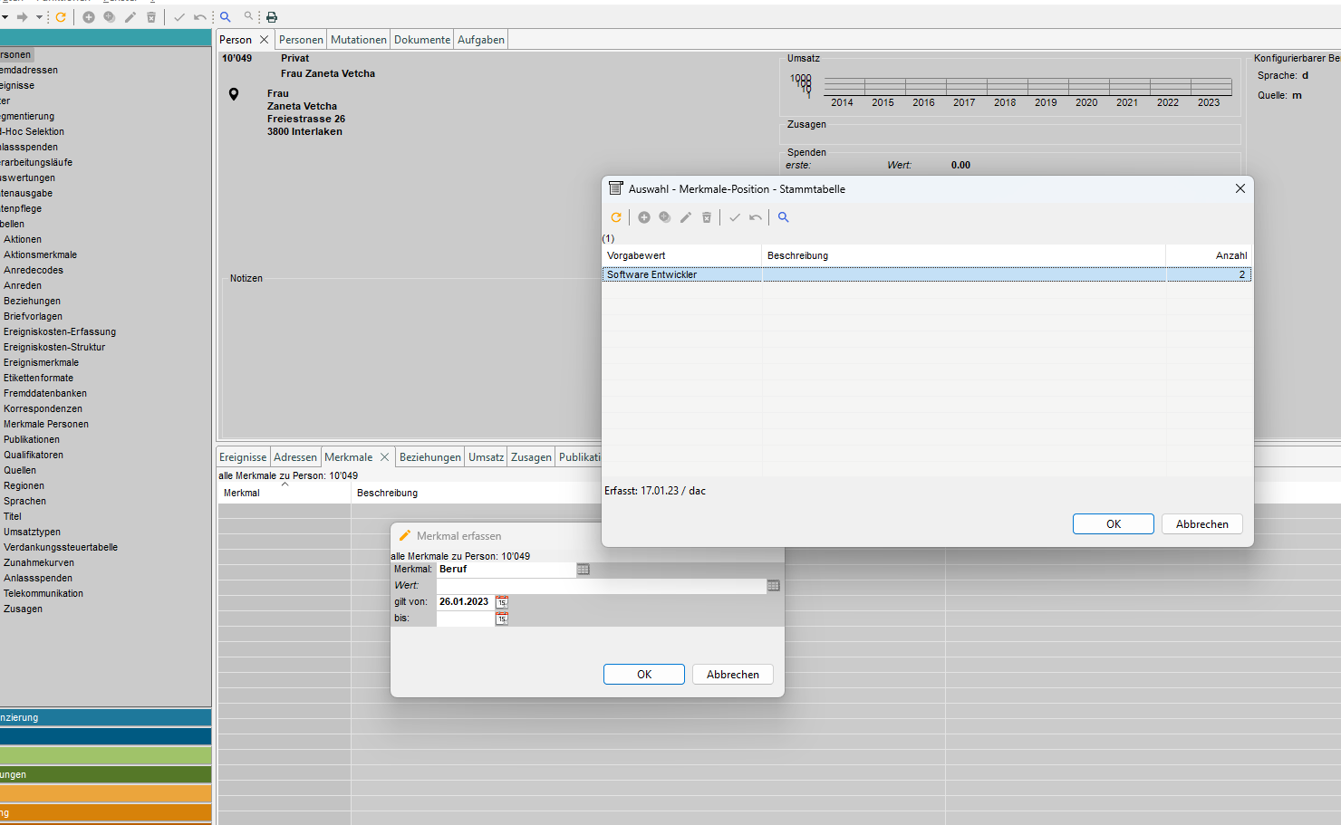 Die Merkmale werden oft bei der Arbeit mit den Personen verwendet. Mit Merkmalen kann man sowohl mit Adressfiltern wie auch mit Segmentierungen bestimmte Personen auswählen. Sie können auch für Auswertungen oder Statistiken verwendet werden wie z.B. bei einer Auswertung der Umsätze aller Stiftungen.