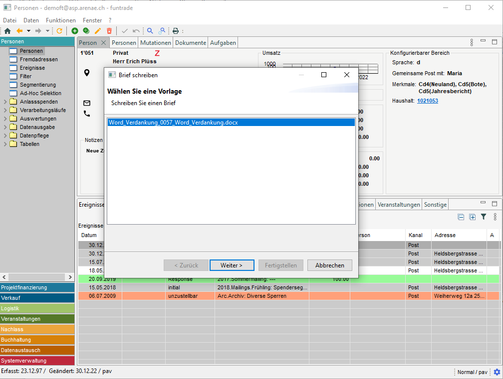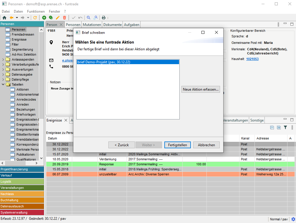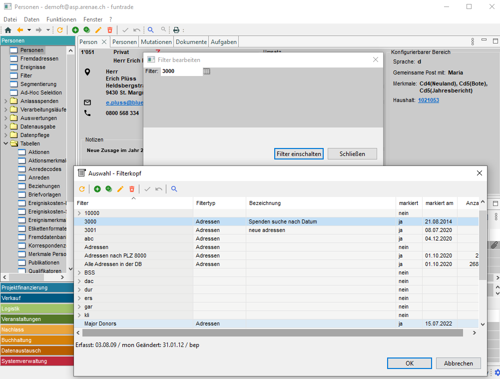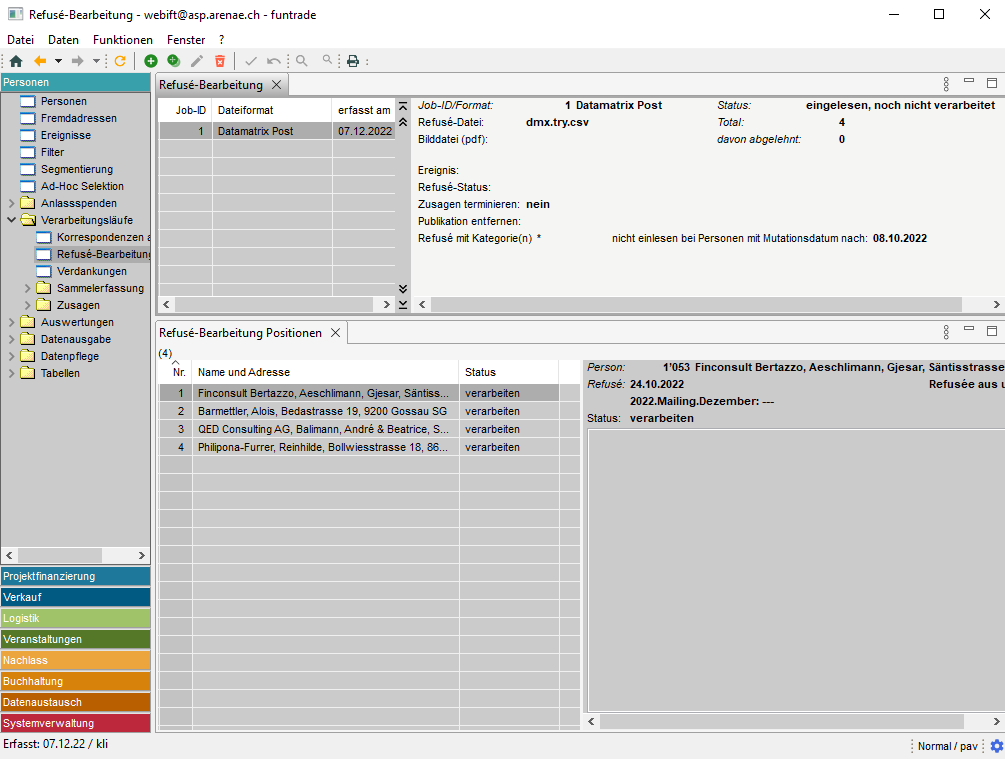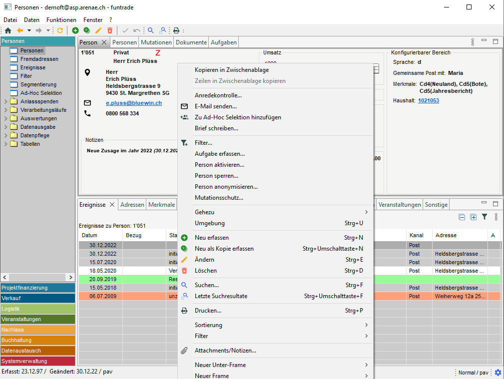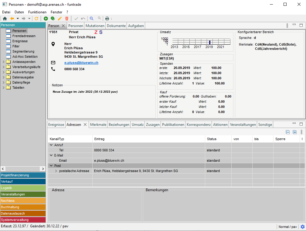 funtrade stellt die:den einzelnen Spender:in und Kund:in der Organisation in den Mittelpunkt. Dabei ist die Unterscheidung von Person und Adresse zentral. Jede denkbare Form, in der Sie mit Ihren Spendenden in Verbindung treten, wird unterstützt – von der Planung über die Produktion und die Verarbeitung des Rücklaufs bis zur Auswertung.Der Bereich «Personen» ist die Basis Ihres Beziehungsmanagements. Damit haben Sie die Tools, um Spender:innen und Kund:innen für die Anliegen Ihrer Organisation zu gewinnen