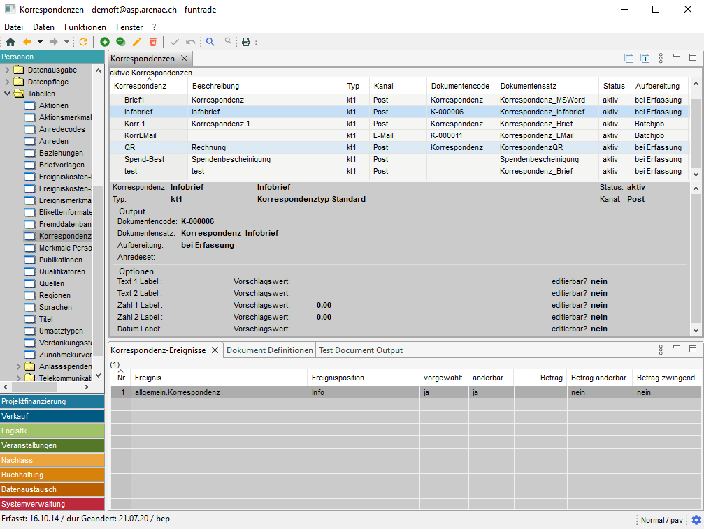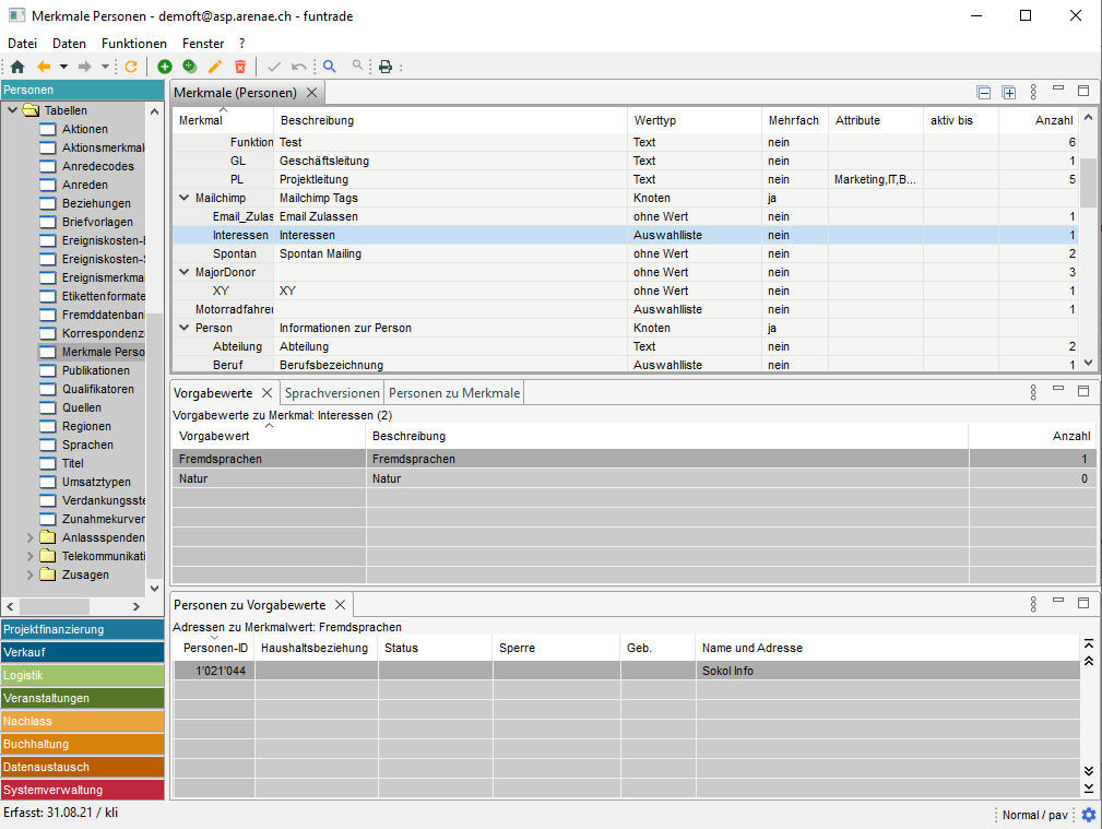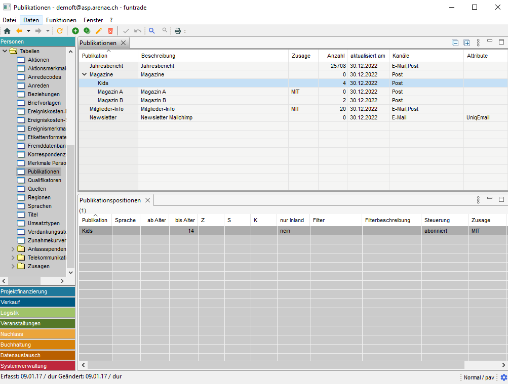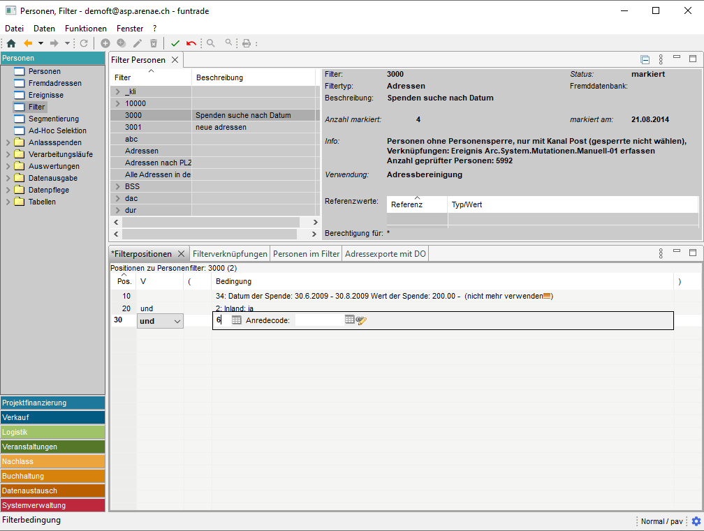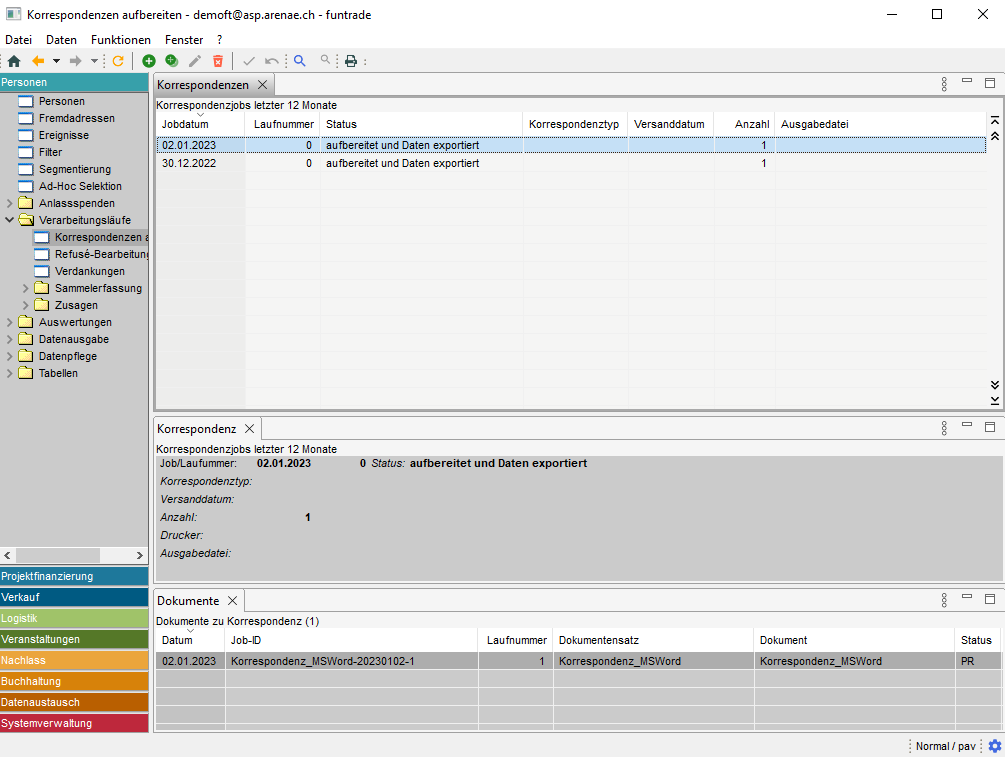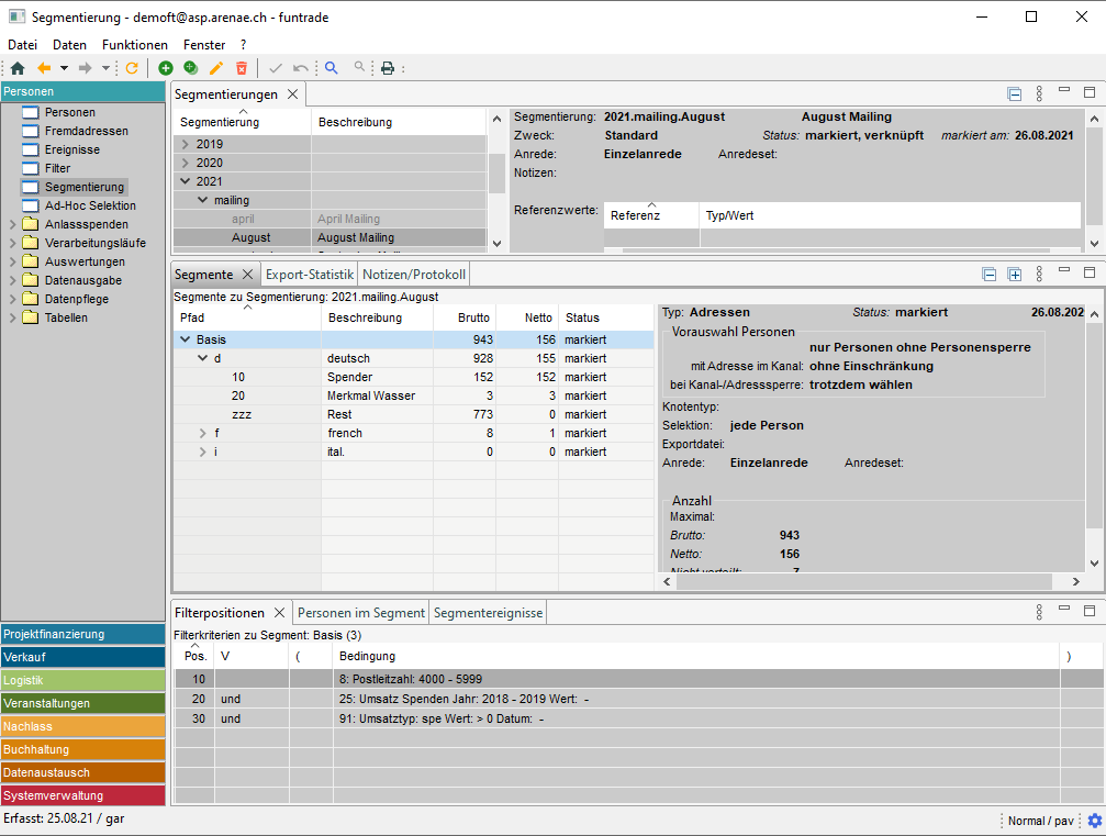 funtrade stellt die:den einzelnen Spender:in und Kund:in der Organisation in den Mittelpunkt. Dabei ist die Unterscheidung von Person und Adresse zentral. Jede denkbare Form, in der Sie mit Ihren Spendenden in Verbindung treten, wird unterstützt – von der Planung über die Produktion und die Verarbeitung des Rücklaufs bis zur Auswertung.Der Bereich «Personen» ist die Basis Ihres Beziehungsmanagements. Damit haben Sie die Tools, um Spender:innen und Kund:innen für die Anliegen Ihrer Organisation zu gewinnen