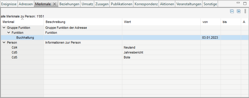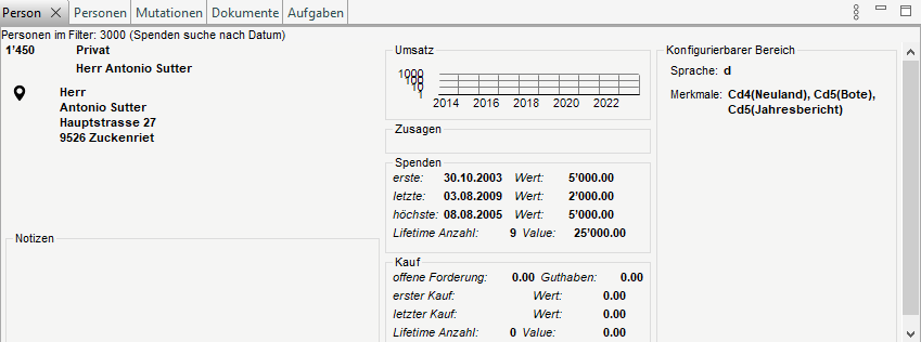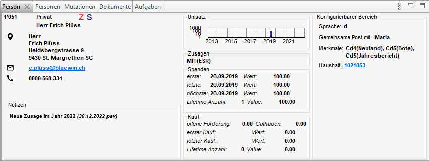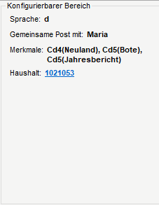 - Im oberen Teil werden verkürzte Informationen über die Person kumuliert. Es ist eine Zusammenfassung der wichtigsten Eigenschaften dieser Person. So ist es z. B. möglich, mehrere postalische Adressen zu haben, von denen eine als Hauptadresse, d. h. als Standardadresse, gekennzeichnet ist.