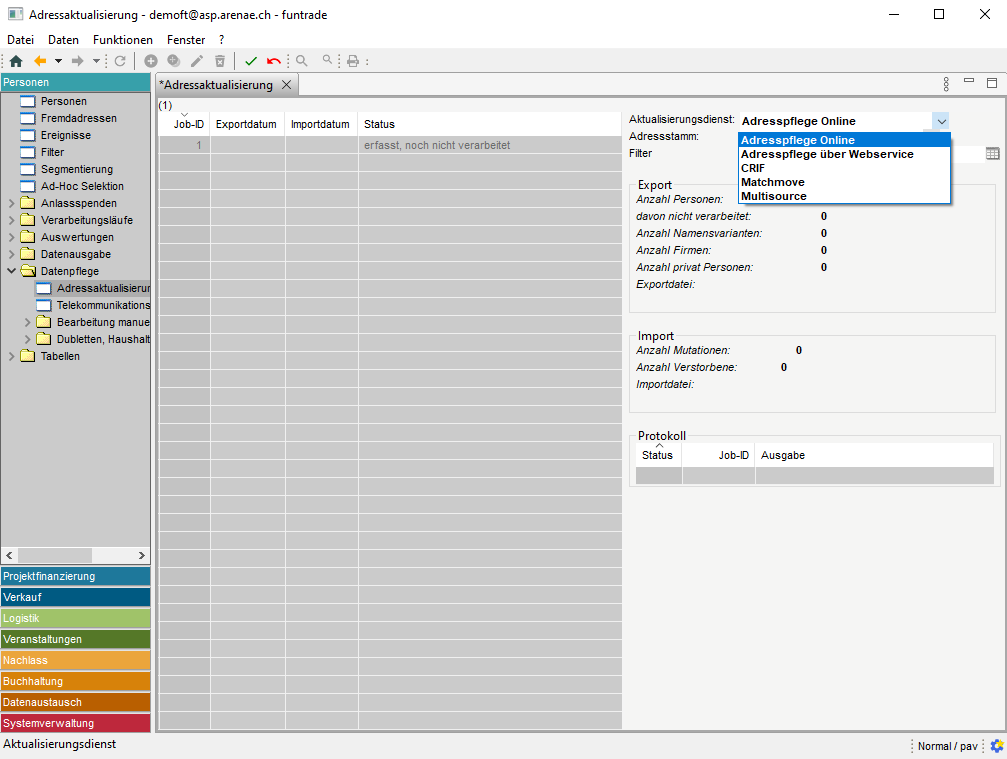 Nach der Adressaktualisierung oder auch beim Testeinlesen wird ein Protokoll der Adressaktualisierung erstellt. Der entsprechende Job mit Protokoll wird hier mittels Status und Job-ID angezeigt.