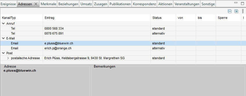 Die Werte von den Felder für Post-Adresse, E-Mail, Telefon und Mobile werden als Standardadressen für den jeweiligen Kanal übernommen.