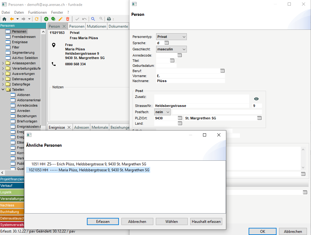 - für erfasste/mutierte Personen werden ähnliche Personen automatisch in der Datenbank gesucht und aufgelistet, um doppelte Einträge zu vermeiden. Ähnliche Personen lassen sich z. B. zu einem Haushalt verbinden.