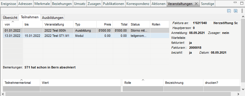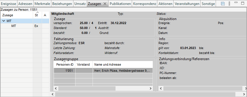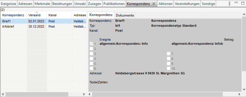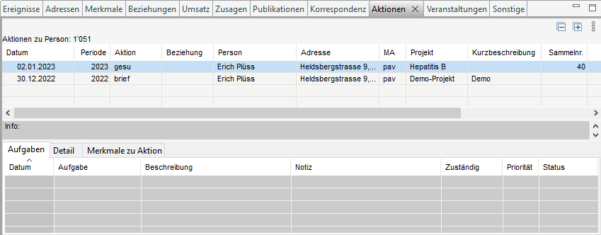 - Im unteren Teil sind detaillierte Informationen zu finden, die nach Quellen gegliedert sind: Ereignisse, Adressen, Merkmale, Beziehungen, Zusagen, Publikationen, Korrespondenzen, Aktionen, Veranstaltungen, Quellen