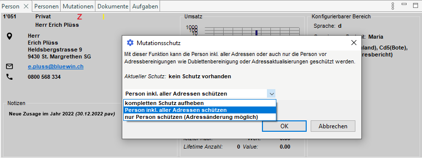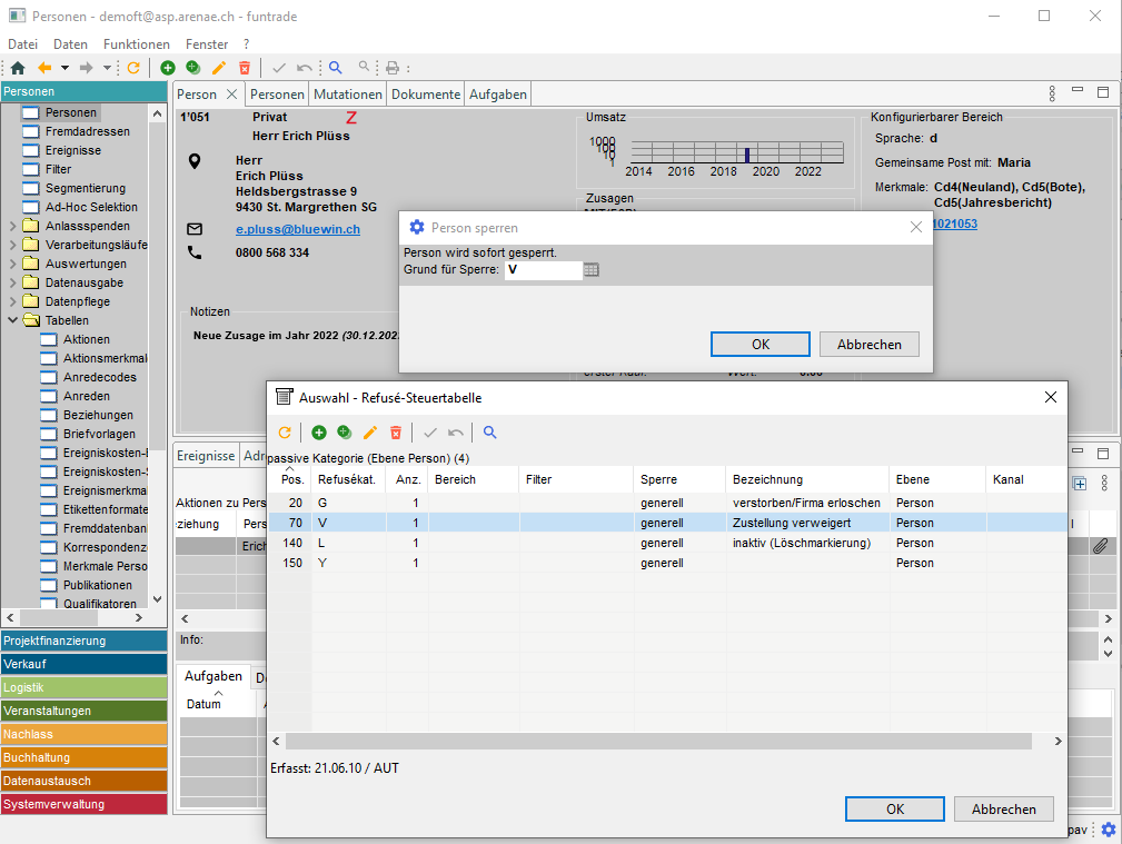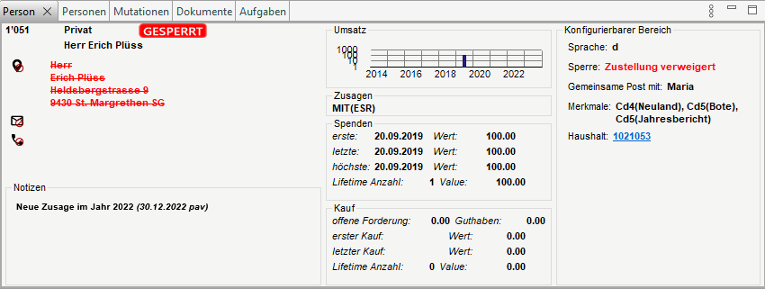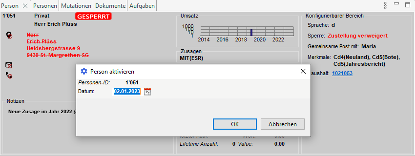 Mit der Funktion lässt sich eine Sperre für eine Person auf Person-Ebene aktivieren. Eine Person-Sperre kann unterschiedliche Gründe haben: Person verstorben, Firma erlöschen, Zustellung verweigert etc.