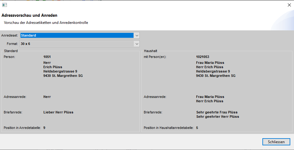 Mit der Funktion „Anredekontrolle" kann man kontrollieren, wie die Adressetiketten, Adressanreden und Briefanreden für Standard-Adresse und Haushalt-Adresse aussehen werden (für ausgewählte Anredeset und Etikettenformat).