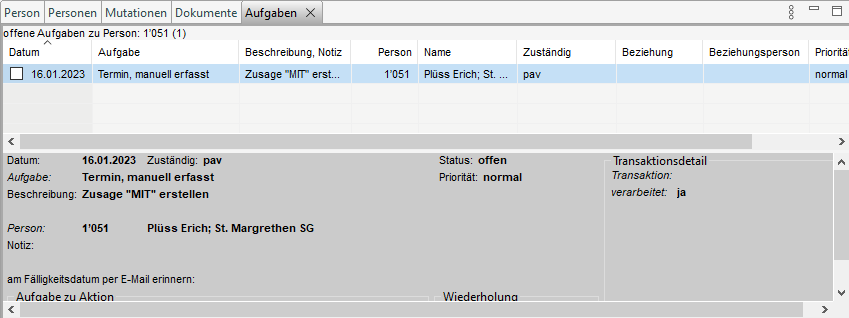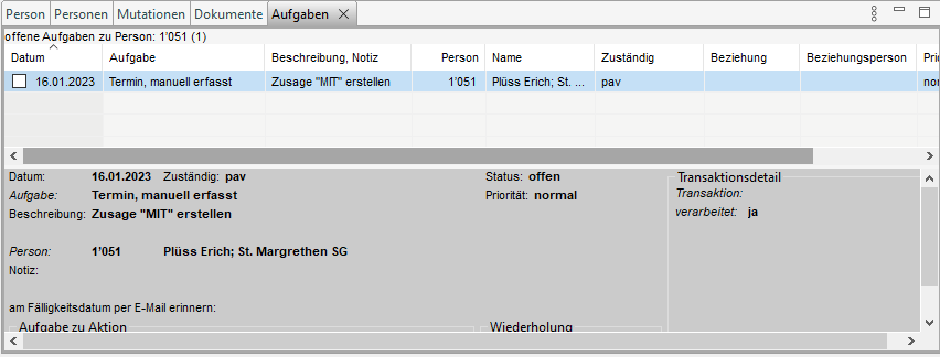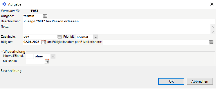Mit der Funktion lässt sich eine terminierte Aufgabe manuell mit der Person verknüpfen.