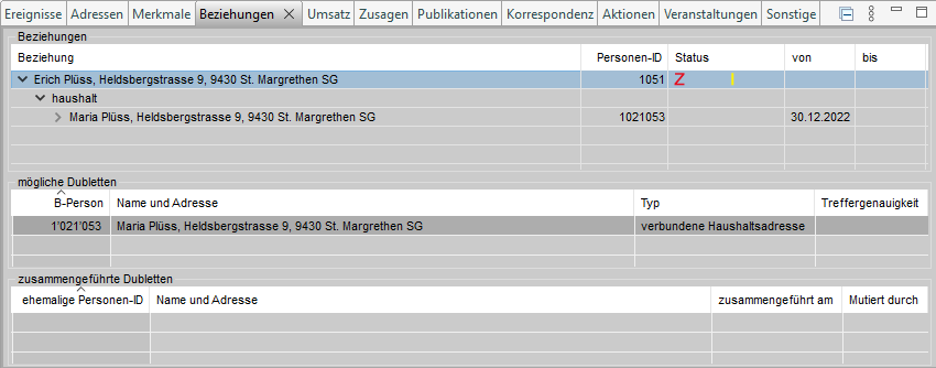 In dieser Ansicht werden mögliche Dubletten und Haushalte manuell bearbeitet. Damit die zu bearbeitenden Daten angezeigt werden, muss vorgängig der Job „Dubletten, Haushalte suchen" ausgeführt worden sein.