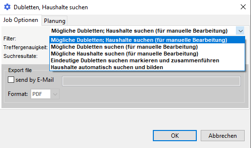 Bei einer grossen Anzahl von Adressen kann es zu Dubletten oder Haushalten – mehrere Personen, wohnen im gleichen Haushalt – kommen. Es gibt Möglichkeiten, diese Fälle zu suchen, zu finden und automatisch bzw. manuell auszulösen.