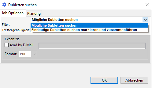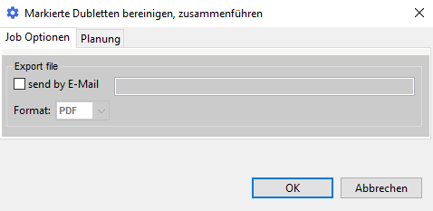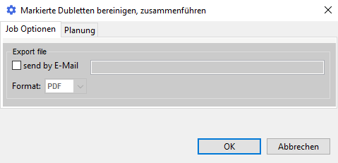 Das Programm sucht automatisch nach Dubletten und markiert diese. Mit zweiter Option können markierte Dubletten überprüft und anschliessend bereinigt werden. Aufgrund der eventuell hohen Laufzeit wird empfohlen, das Programm im Hintergrund zu starten.