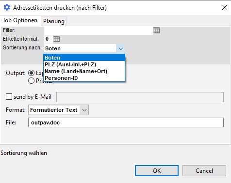 Ausgabe bietet auch die Möglichkeit, Etiketten nach Personenfilter drucken. Es lassen sich Personen sortieren nach verschiedenen Feldern oder nach vorsortierten Boten.