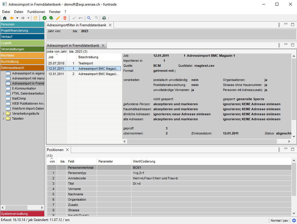 Beim Import überprüft das Programm die gefundenen Mutationen, fügt die Adressänderungen in die Datenbank ein und erstellt ein Protokoll derjenigen Fälle, die nicht eindeutig zugewiesen werden konnten, zur manuellen Nachbearbeitung. Bei Personen die als gestorben gemeldet wurden, werden zusätzlich alle allfälligen Zusagen per Tagesdatum beendet.