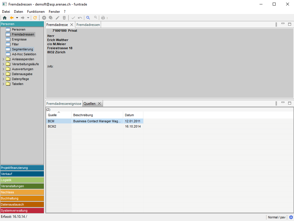 Zu jeder Person lässt sich eine Standard-Adresse erfassen, zusätzliche alternative Adresse oder Adressen, die in der Zukunft ab einem bestimmten Zeitpunkt gelten, z. B. geplanter Umzug. Als Kanal bietet funtrade folgende Adresse-Möglichkeiten: