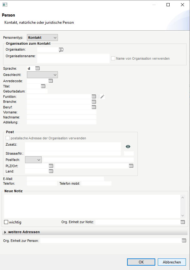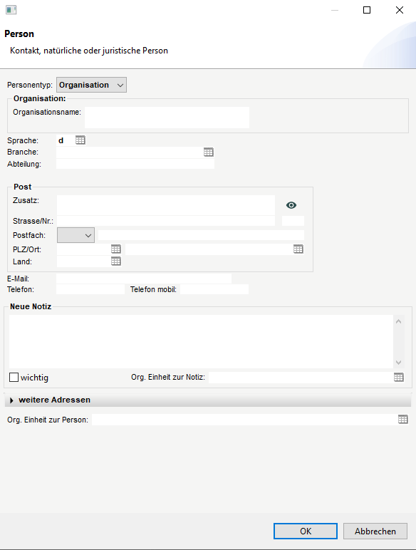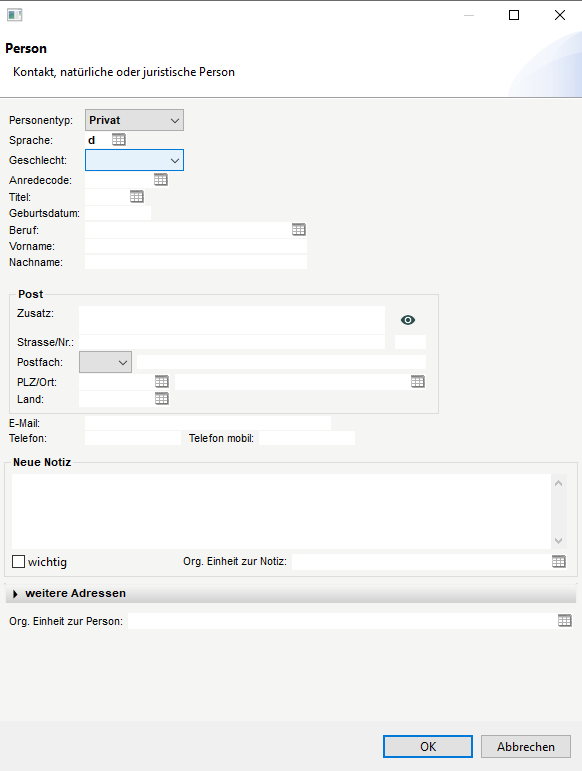Das Erfassen / Mutieren der Person wird in einem speziellen Dialogfenster geführt, wo sich alle wichtigen Informationen zur Person definieren lassen. Zuerst kommt die Wahl des Personen-Typs und anschliessend spezifische Felder zum Update.