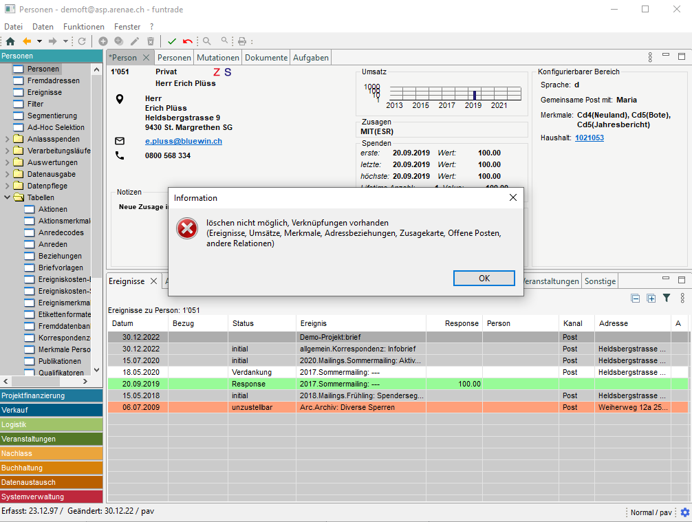 Während der Existenz einer Person werden verschiedene zusätzliche Informationen zu der Person hinzugefügt und die Person ist mit anderen Entitäten verbunden. Diese Verknüpfungen werden beim Löschen kontrolliert. Die Person kann nur gelöscht werden, wenn keine solche Verknüpfung existiert.