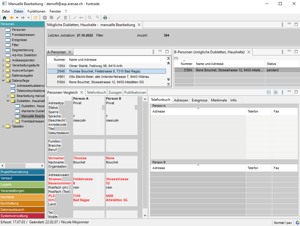 Es gibt mehrere Funktionen zur Suche und Zusammenführung von Dubletten und Haushalten.