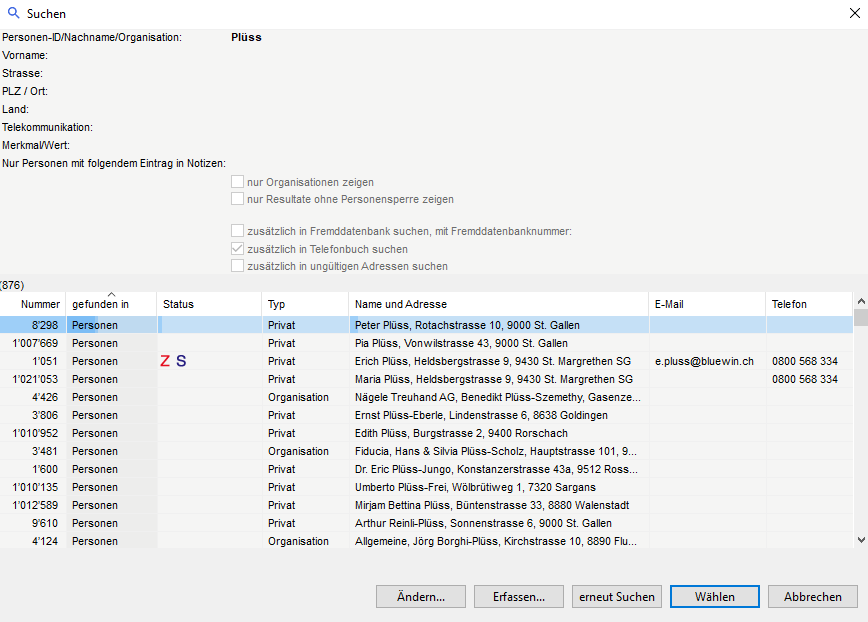 Mit den Schaltflächen am unteren Rand des Suchdialogs kann man eine bestimmte Person aus der Ergebnisliste auszuwählen (Wählen) oder ändern in einem Edit-Dialog (Ändern...) oder einen Person Erfassungsdialog starten (Erfassen...), in dem die Suchattribute automatisch übernommen werden.